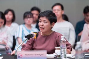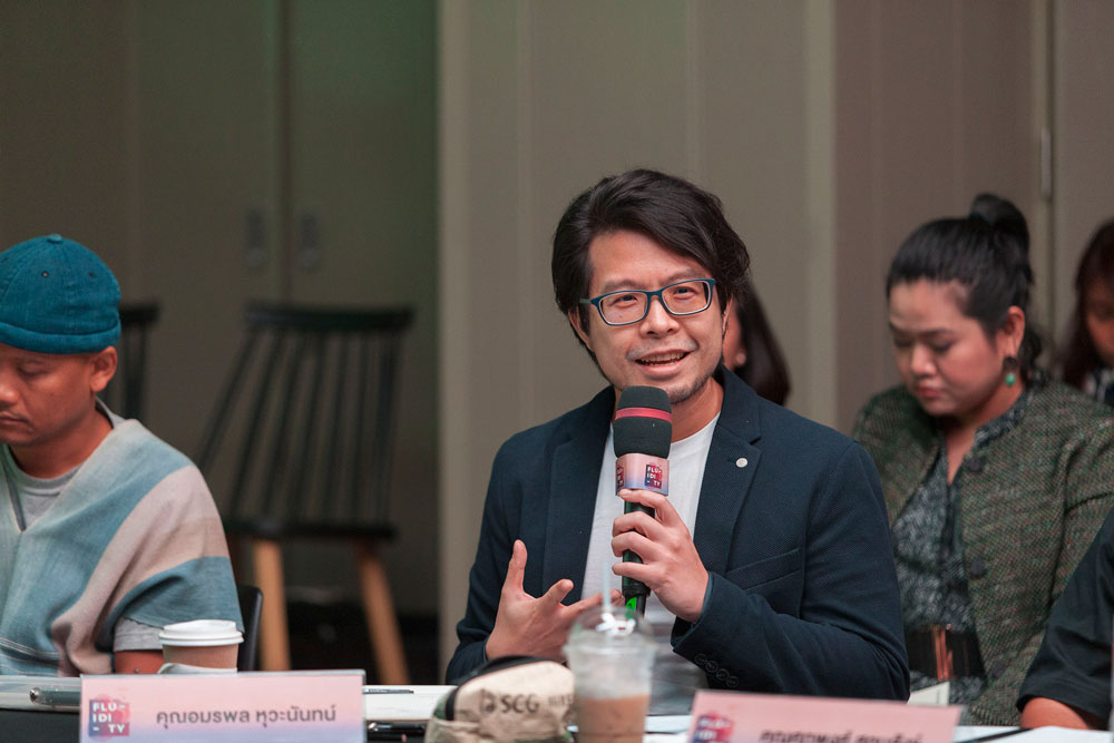 ดร.ภูมิพร ธรรมสถิตเดช: “เรื่องของ knowledge sharing สามารถเป็นไปได้หลายกลุ่ม User ผมมองว่าต่อไปเป็นสังคมผู้สูงอายุ ใช่ไหมครับ คนที่เขาอยากได้ skill ก็มีที่เปิดสอนให้ผู้สูงอายุมาทำเรื่อง Internet of Thing หรือเรียน programming ผู้สูงอายุมีเวลาเยอะ ถ้าเขาสนใจ เขาก็จะสามารถใช้เวลทำเรื่องเหล่านี้ได้ ถ้าเขาสนใจเรื่องของคราฟต์ก็จะเกิดเป็นกลุ่มงานคราฟต์ได้ไม่ยาก และ Cloud ก็สามารถเสริมในจุดนั้นได้ จนถึงการที่ skill ทั้งหลายจะ cross กันได้ เพราะฉะนั้นพรมแดนก็อาจจะง่ายขึ้น มีประสบการณ์ให้แลกเปลี่ยนจากหลากมุมมองมากขึ้น ซึ่งเราเองก็น่าจะลอง test ดูเหมือน craft simulation หรือ craft lab อะไรสักอย่างหนึ่ง แล้วดูสิว่าตอนจบของเรื่อง เรื่องของตัวนิยามแบบใหม่ที่ทำมันจะเป็นอย่างไรเพราะผมเชื่อว่าผู้เชี่ยวชาญที่มี skill ก็จะมีบทบาทกว้างขวางขึ้นในอนาคต”