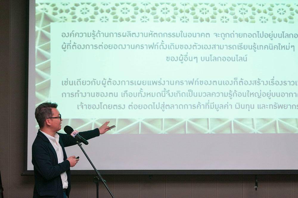 คุณพันธวิศ ลวเรืองโชค : “สำหรับคำว่า Craft Citizenไม่ใช่แค่ผู้ผลิต แต่ยังต้องใส่ใจกับผู้ซื้อด้วยพฤติกรรมผู้บริโภค อาจจะต้องแบ่งเป็น Segment ต่าง ๆ กัน เช่น คนที่อายุต่ำกว่า 40 ปี ก็จะซื้อเพราะความชอบความสวยงาม แต่ถ้ามากกว่านั้นจะเริ่มเป็นเรื่องของการลงทุนแล้ว ผมรู้สึกว่าการวิเคราะห์ผู้บริโภคที่เป็น Segment จริง ๆ อันนี้น่าจะส่งเสริมตรงนี้ ไม่ใช่การวิเคราะห์การตลาดที่แบบอ่านเจอในแบบทั่ว ๆ ไป เพราะการขายในปัจจุบัน มันมี agenda มากกว่าแค่ชอบแล้วก็ซื้อ การซื้อเพื่อ Influence บางอย่าง ซื้อเพื่อเก็งกำไร เพื่อคอนเน็กชั่น มันควรถูกวิเคราะห์ให้ละเอียด เพื่อจะได้เข้าใจทั้งฝั่งของ Designer และ ฝั่งของ Customer ควบคู่กันไป”