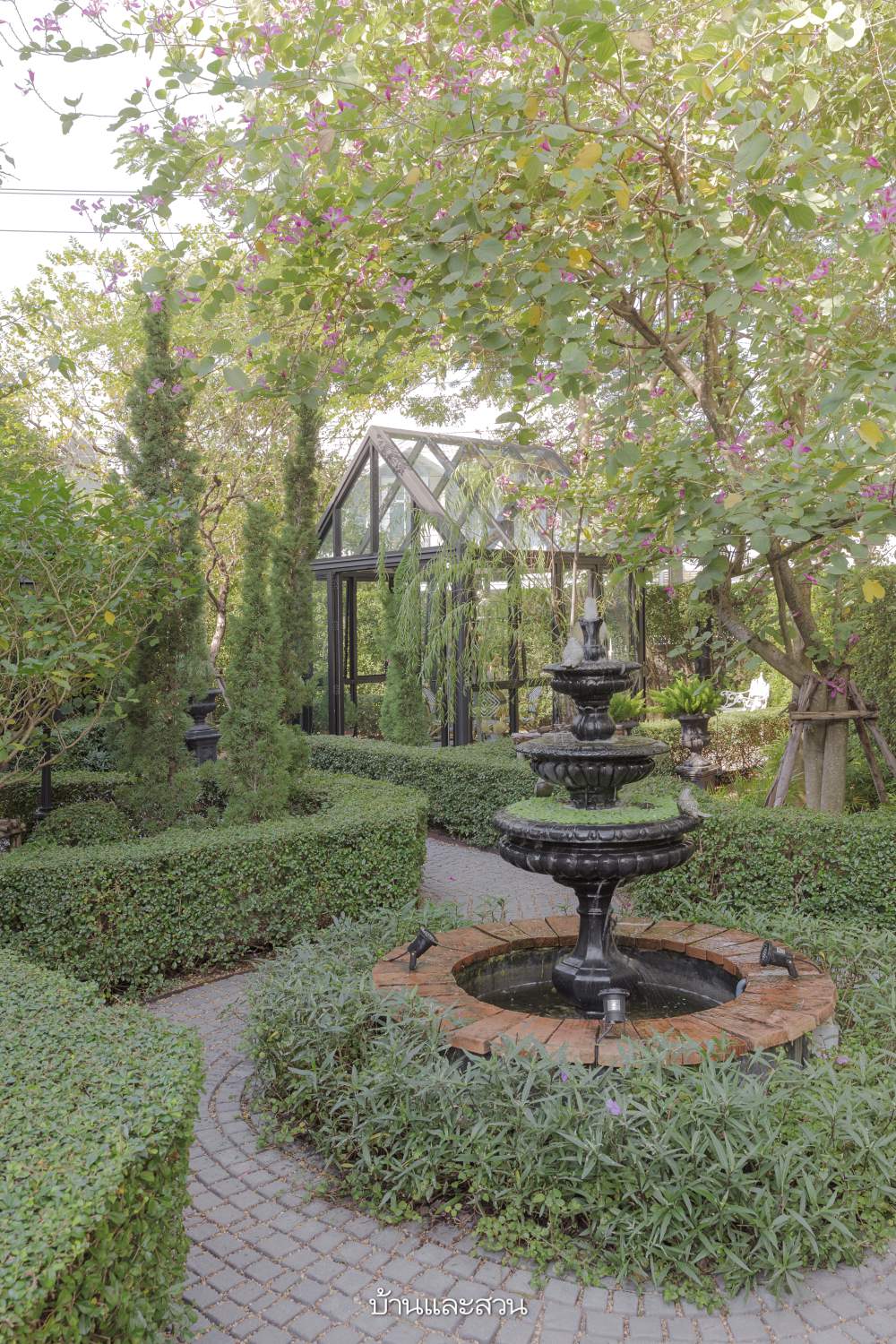 จากภายนอกบ้านที่ถูกบังด้วยไทรเกาหลีเป็นแนวรั้วสูงทึบ ภายในบ้านกลับซ่อนสวนที่ดูโล่งสบายตา และเขียวชอุ่มไปด้วยสีเขียวของใบไม้ เห็นน้ำพุตั้งเด่นอยู่กลางวงเวียน มองไปไกลๆ เห็นกลาสเฮ้าส์หลังย่อมๆ ตั้งอยู่ใต้ร่มไม้ใหญ่ ถัดไปเป็นศาลาขนาดใหญ่ข้างบ้าน ซึ่งคงมองไม่เห็นหากไม่เดินเข้ามา เป็นสวนที่ทำให้รู้สึกสนุกในการเดิน เหมือนต้องค้นหาว่าจะมีอะไรแอบซ่อนอยู่ต่อไป