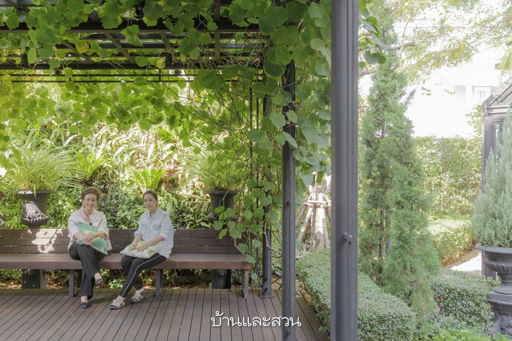 “ส่วนตัวชอบสวนอังกฤษ คุณแม่เองก็ชอบต้นไม้เยอะๆ สมัยเด็กๆ คุณแม่โตมากับบ้านที่มีต้นไม้ มีคลอง ทีแรกก็อยากมีสระว่ายน้ำนะคะ แต่พอมาคิดดูแล้วถึงมีก็คงไม่ได้ใช้ เอาพื้นที่ไปปลูกต้นไม้ทำสวนน่าจะเหมาะกว่า บอกคุณอั๋นว่าอยากได้น้ำพุ ตอนนั้นคุณพ่อเพิ่งออกจากโรงพยาบาลมาพักฟื้นที่บ้านด้วยค่ะ อยากให้ท่านได้รู้สึกพักผ่อน อยากให้มีที่เดินเล่นนั่งเล่น อีกอย่างคืออยากได้กลาสเฮ้าส์ เพราะเห็นของต่างประเทศแล้วชอบ แต่ห่วงว่าพื้นที่บ้านเราจะเหมาะสมไหม โชคดีที่มีต้นไม้ใหญ่ของทางโครงการอยู่บริเวณนั้นพอดี แม้ตอนกลางวันจะมีแดดหน่อย แต่ก็ยังเข้ามานั่งเล่นได้ ไม่ได้รู้สึกว่าร้อนมากค่ะ ส่วนเรื่องต้นไม้ไม่ได้ระบุเป็นพิเศษ ขอแค่ให้เหมาะกับสภาพอากาศบ้านเราก็พอค่ะ”