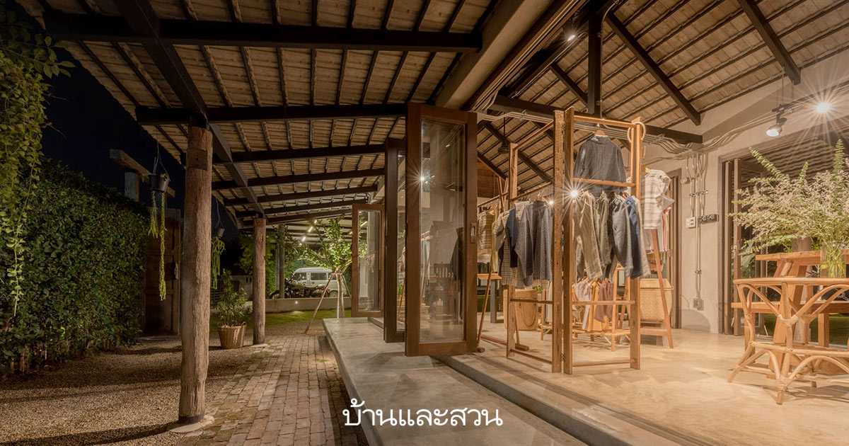 เมื่อเดินเข้ามาจากรั้วบ้าน สิ่งแรกที่จะได้พบคือ สตูดิโอของแบรนด์เสื้อผ้าฝ้ายญี่ปุ่นที่ออกแบบได้อย่างน่ารัก ถัดมาเป็นคอร์ตกลางของบ้านที่ภาษาเหนือเรียกว่า “ขวงบ้าน” ในส่วนนี้คุณปกรณ์เลือกที่จะออกแบบบ้านและสตูดิโอให้ล้อมขวงบ้านนี้เอาไว้ โดยมีต้นจิกเป็นไม้ประธานข้างตัวบ้าน  เเละปลูกแปลงผักสวนครัวไว้ที่ริมรั้วบ้านฝั่งตะวันออก
