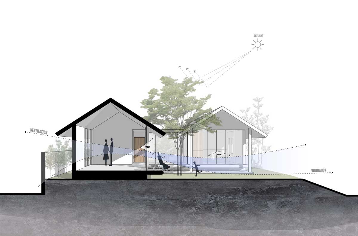 แผนผังแสดงการวางตัวของบ้านที่เปิดโอกาสให้กระเเสลมสามารถพัดผ่านตัวบ้านได้โดยสะดวก ด้วยการทำช่องเปิดขนาดใหญ่ และเว้นที่ว่างเป็นสวนลับให้บ้านได้หายใจ
