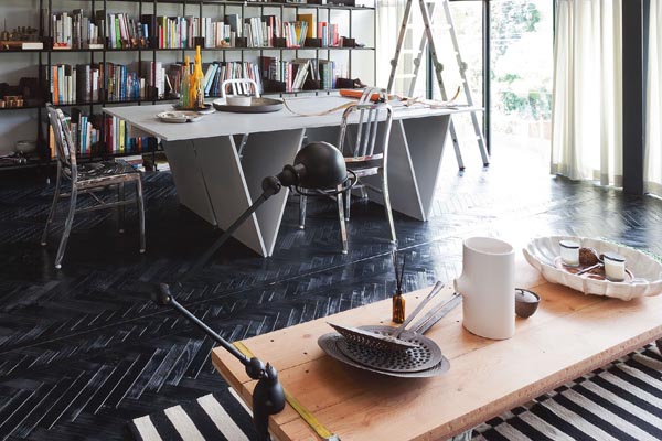 ปูพื้นด้วยไม้ปาร์เก้แล้วทาสีทับหน้าวัสดุ ทำให้ลวดลายของไม้โดดเด่นขึ้นมา ยิ่งเสริมด้วยโต๊ะทำงานสีขาว ช่วยให้ห้องทำงานดูมีอะไรมากยิ่งขึ้น