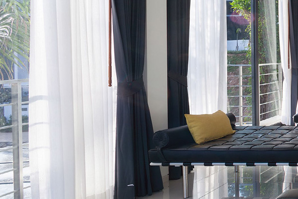 การใช้ผ้าม่านสีขาวสลับกับผ้าม่านสีดำ ช่วยเพิ่มลูกเล่นตรงระเบียงให้ดูโดดเด่นและไม่จืดชืดจนเกินไป