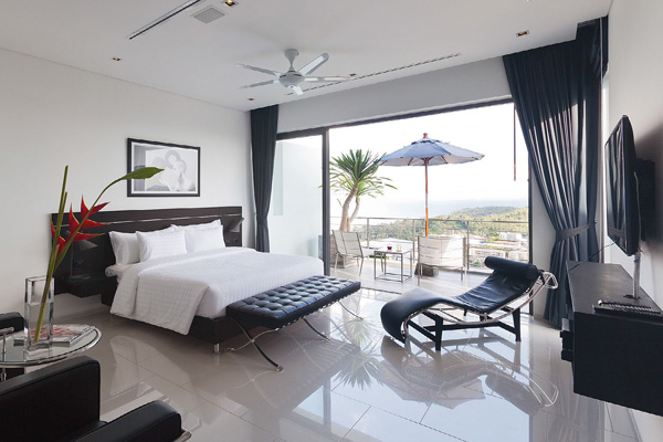 การใช้เฟอร์นิเจอร์สีดำตัดกับผ้าปูที่นอนและผ้าม่านสีขาว ช่วยขับสไตล์ความเรียบหรูที่ผสานกันได้อย่างลงตัว