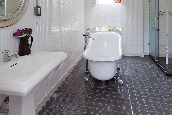การใช้สีขาว-ดำ มาเป็นคู่สีในการตกแต่งทำให้ห้องน้ำธรรมดาๆดูเรียบหรูขึ้นมาในทันใด โดยเมื่อเพิ่มลูกเล่นเป็นการปูกระเบื้องโมเสคและมีอ่างอาบน้ำดีไซน์เก๋ๆมาวางกลางห้องน้ำแล้วนั้นก็ช่วยขับความเรียบหรูขึ้นมาได้เป็นอย่างดี