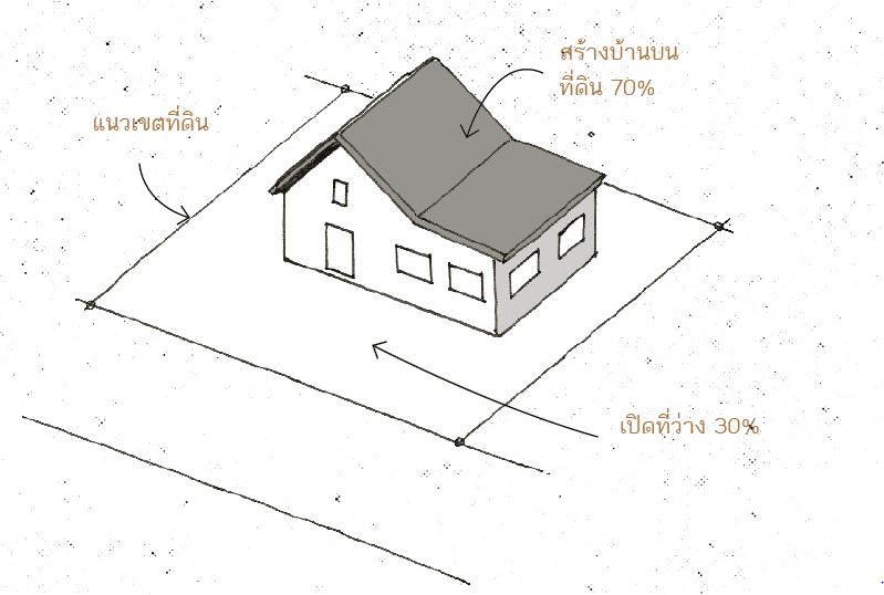 หมายถึง ห้ามสร้างบ้านใหญ่จนเต็มพื้นที่ปลูกสร้าง เช่น ถ้ามีที่ดิน 100 ตารางวา ก็จะสามารถสร้างบ้านได้เพียง 70 ตารางวาเท่านั้น ส่วนที่เหลือไว้ควรแบ่งเป็นพื้นที่สีเขียวและระยะถอยร่นออกจากแนวเขตที่ดิน