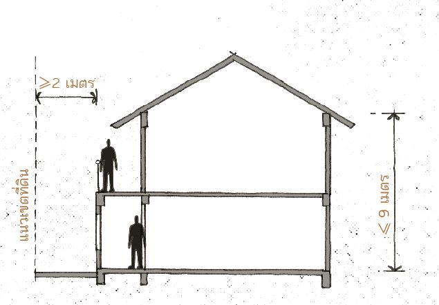 - อาคารที่มีความสูงไม่เกิน 9 เมตร แนวผนังหรือระเบียงต้องห่างจากเขตที่ดินไม่น้อยกว่า 2 เมตร