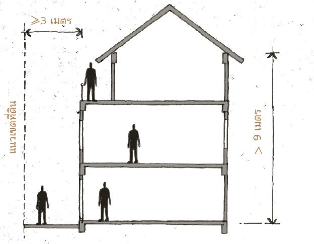 - อาคารที่มีความสูงเกิน 9 เมตร แนวผนังหรือระเบียงต้องห่างจากเขตที่ดินไม่น้อยกว่า 3 เมตร