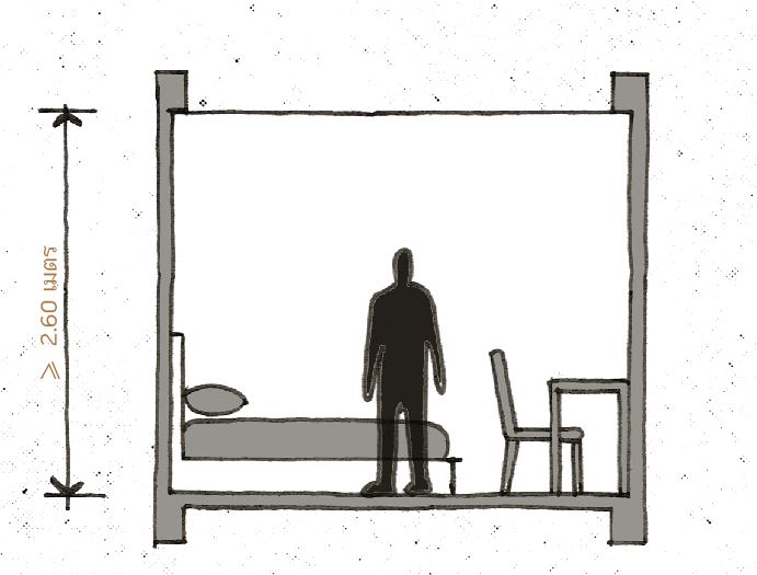 ฝ้าเพดานภายในห้องพักอาศัยต้องมีความสูงอย่างน้อย 2.60 เมตร และฝ้าเพดานห้องน้ำต้องมีความสูงอย่างน้อย 2 เมตร (ใต้ชานพักบันไดที่มีระยะฝ้าเพดานอย่างน้อย 2 เมตรก็สามารถทำห้องน้ำได้)