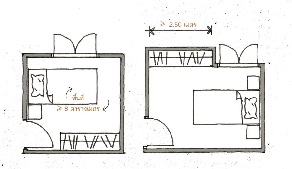 กฎหมายกำหนดให้ห้องนอนต้องมีขนาดพื้นที่รวมไม่น้อยกว่า 8 ตารางเมตร แต่ถ้าห้องนอนไม่ใช่รูปสี่เหลี่ยม [อาจเป็นรูปตัวแอล (L)] ด้านที่แคบสุดต้องกว้างไม่น้อยกว่า 2.50 เมตร และต้องมีช่องระบายอากาศออกสู่ภายนอกขนาดไม่น้อยกว่า 10% ของพื้นที่ห้อง