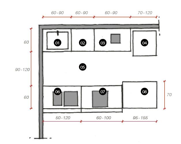 พื้นที่สำคัญสำหรับใช้เตรียมทุกเมนูไม่ว่าจะอาหารหรือเครื่องดื่ม มีการใช้งานหลัก 8 ส่วน ตามตัวอย่าง ได้แก่