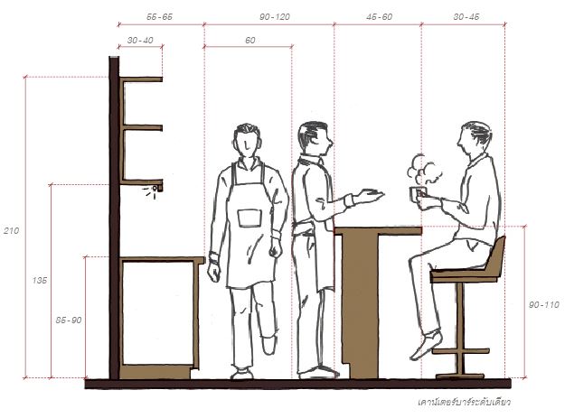- เคาน์เตอร์บาร์สองระดับสำหรับให้พนักงานทำงานไปด้วยได้