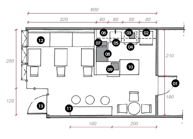 พื้นที่ 3 x 3 เมตร ร้านขนาดเล็กที่อาจเป็นร้านสำเร็จรูปหรือใช้พื้นที่มุมใดมุมหนึ่งในอาคาร เหมาะกับการทำเคาน์เตอร์เป็นรูปตัวแอล (L) เพื่อให้สามารถใช้งานพื้นที่ได้อย่างคุ้มค่า