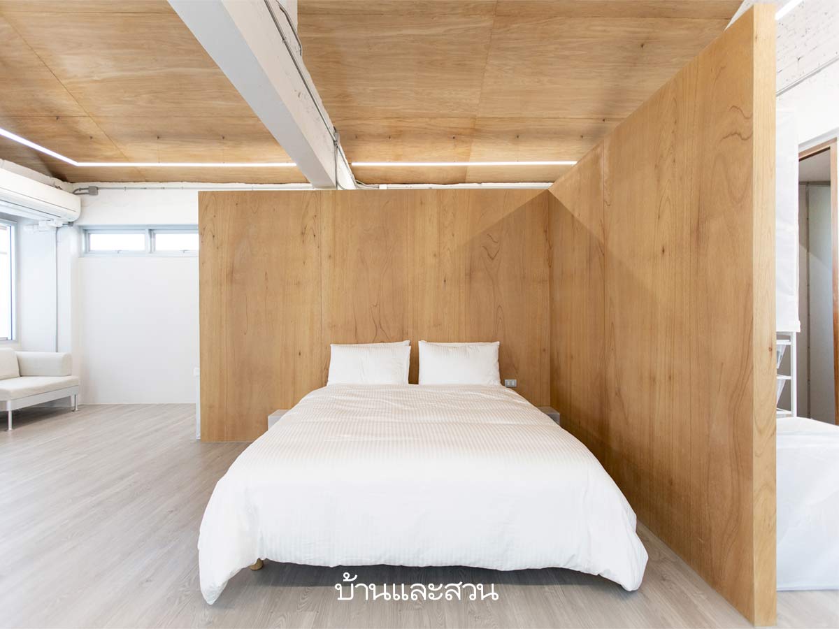 “เพราะว่าเจ้าของบ้านเขาอยากได้พื้นที่กึ่งสนามเด็กเล่นห้ลูก ๆ ได้วิ่งเล่น ถ้าดูจากผังก็จะเห็นได้เลยว่าห้องนอนที่โล่งแบบนี้ เพราะลูกเขาสามารถวิ่งเล่นรอบห้องได้อย่างเต็มที่จริง ๆ แล้วพื้นที่ที่เหลือก็เผื่อไว้เอกเขนกนอนเล่นกับลูกได้ เราจึงทุบผนังเดิมออกจนหมด และเลือกใช้ผนังเบาแค่กั้นให้การใช้งานดูเป็นสัดเป็นส่วนก็พอ ห้องนอนนี้แทบทุกอย่างจะเป็นเฟอร์นิเจอร์ลอยตัว แม้แต่โต๊ะทำงาน เพราะการมีลูกเล็กจะทำให้อาจต้องมีการปรับการใช้งานอยู่เรื่อย ๆ ต่อไปในอนาคต”