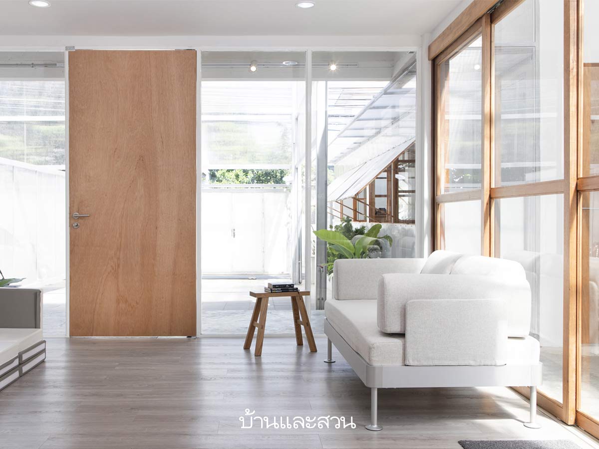 การเลือกใช้วัสดุในบ้านหลังนี้ สังเกตได้ว่าจะเป็นวัสดุสีขาวและไม้เป็นส่วนใหญ่ “เพราะเจ้าของบ้านอยากให้บ้านออกมาสว่างและมีสิ่งรบกวนสายตาน้อยที่สุด เราจึงตั้งใจปรุงแต่งวัสดุให้น้อยที่สุด และเลือกใช้วัสดุที่เหมาะสมกับงบประมาณ อย่างหลายจุดนั้นเราเลือกใช้ไม้อัดยาง ซึ่งพอนำมาขัดผิวและเคลือบแล้วก็พบว่าใช้ได้ดี แต่ในบางจุดที่ต้องการความคงทนเช่น บานประตู ก็เลือกเป็นไม้ตะแบก เพื่อให้เหมาะกับการใช้งานมากขึ้น ดีที่เจ้าของบ้านเองก็เห็นชอบด้วย เรื่องวัสดุนี้จะให้มันออกมาดูดีได้ เราว่ามันอยู่ที่ดีเทลที่เราเลือกใช้ และรู้วิธีที่จะจัดการกับมันมากกว่า จึงมาจบที่วัสดุไม้กับสีขาวอย่างที่เห็น”