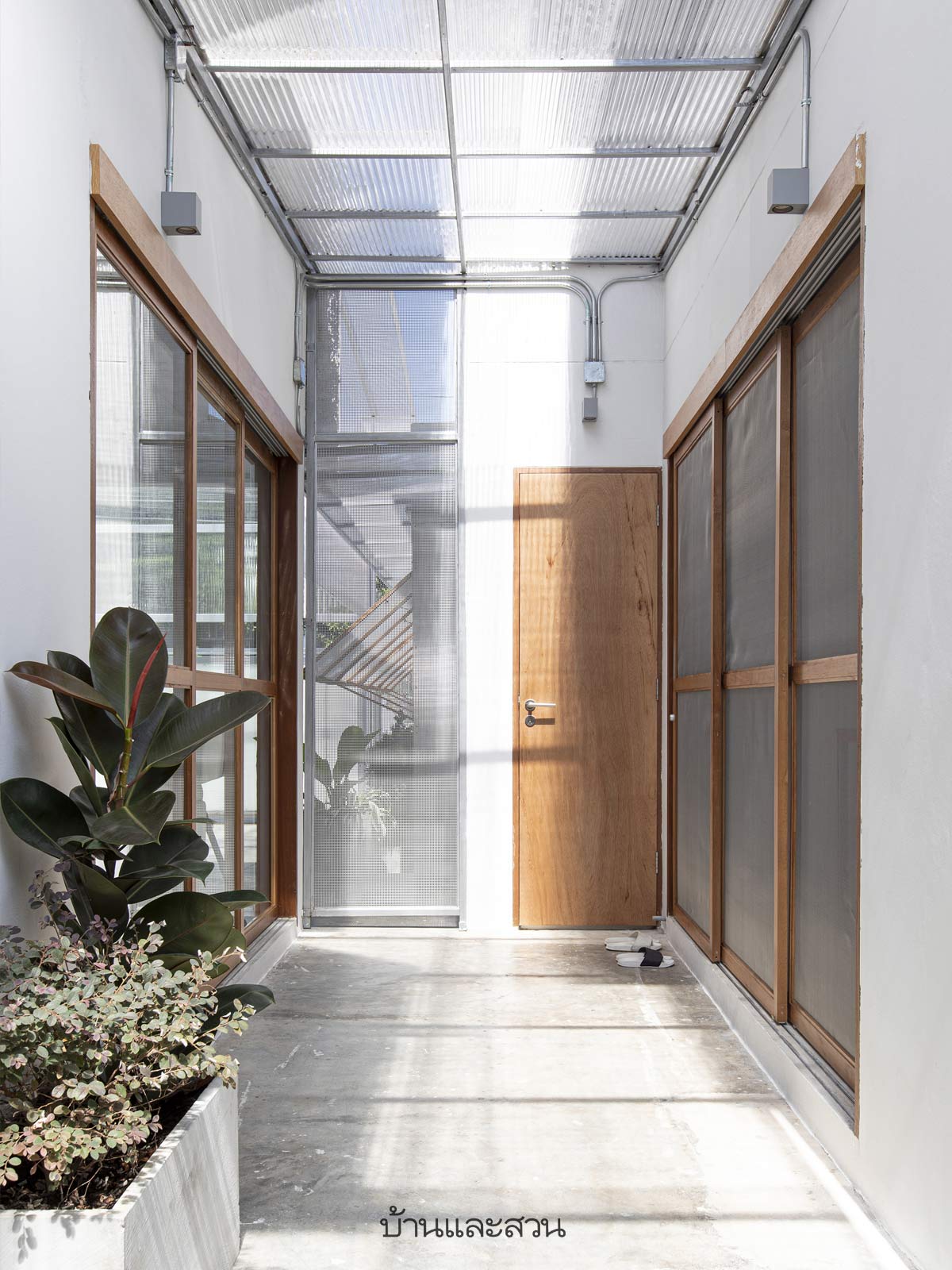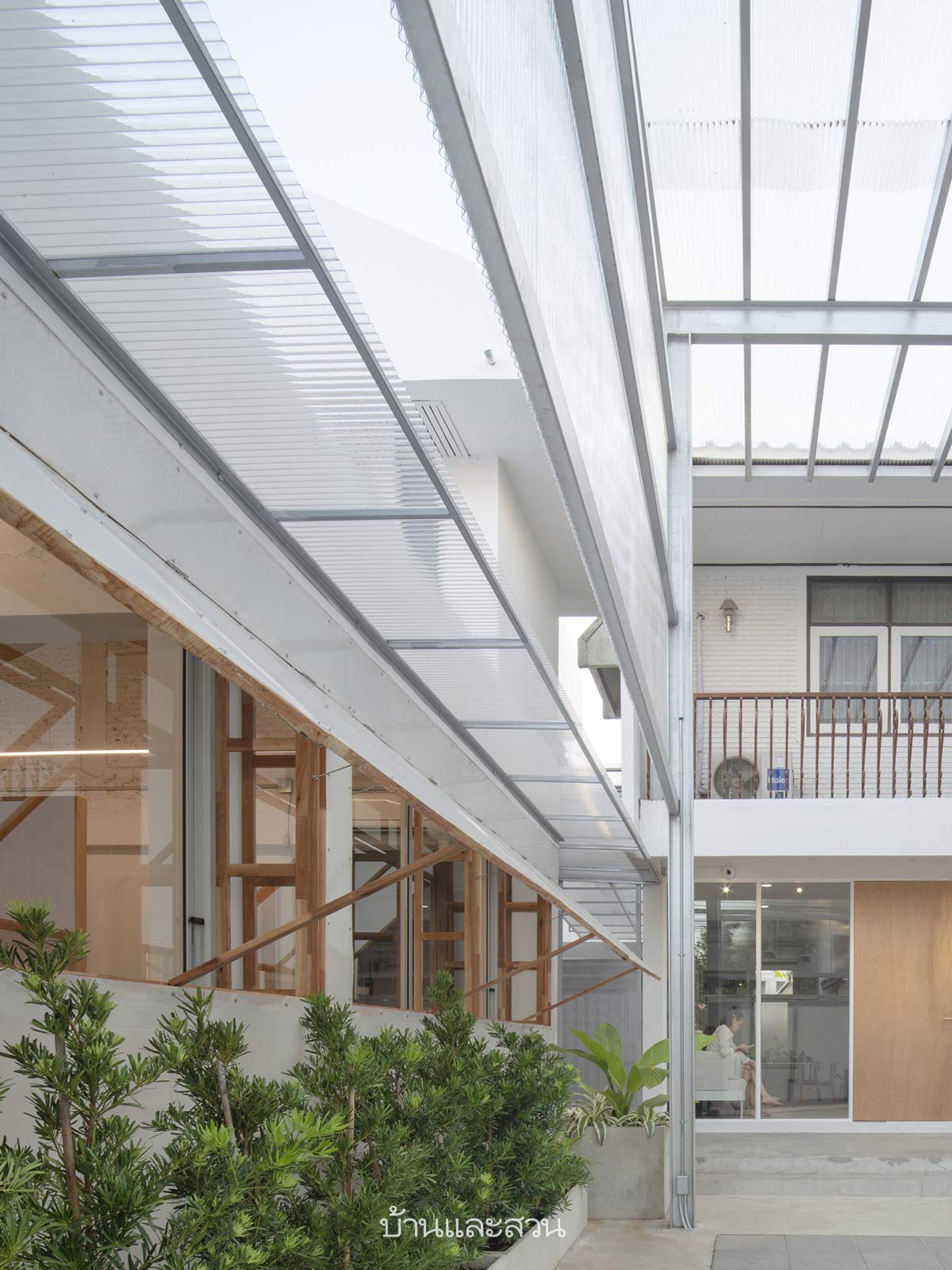 บ้านมินิมัล ที่เกิดจากการเชื่อมต่อบ้านหลังใหญ่และบ้านหลังรองที่อยู่ด้านหน้าให้เป็นหนึ่งเดียว โดยห่อหุ้มพื้นที่รอบบ้านด้วยเเผ่นพอลิคาร์บอเนตโปร่งเเสงเเต่ไม่โปร่งใส