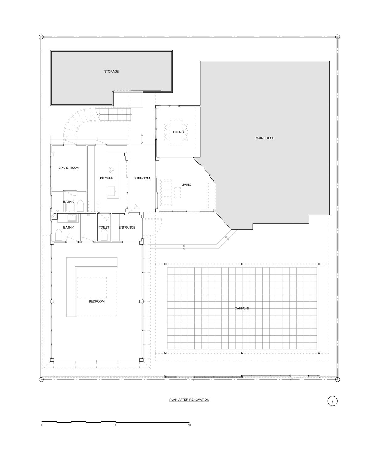 ทางด้านซ้ายของบ้านหลักคือ บ้านที่รีโนเวตขึ้นมาใหม่ สำหรับครอบครัวของคุณสุกี้และคุณปอย ชั้นล่างออกแบบให้ต่อเนื่องกับ Sun Room และห้องนั่งเล่น-รับประทานอาหาร ด้านหน้าเป็นห้องแบบสตูดิโอไทป์ ที่เมื่อมองจากลานหน้าบ้านจะเห็นเป็นผนังบานกระทุ้ง ซึ่งภายในนั้นได้ออกแบบให้เป็น Double Facade มีบานเลื่อนกระจกขนาดใหญ่อยู่ด้านในอีกชั้นหนึ่ง การออกแบบฟาซาดที่ซ้อนกันเช่นนี้ คุณเคตั้งใจให้เส้นกรอบของบานแต่ละบานทับซ้อนกันอย่างพอดี เพื่อลดเส้นสายที่มีมากเกินไปให้น้อยลง ส่วนของบานกระทุ้งนั้นทำขึ้นเพื่อตั้งใจสร้าง “ความรู้สึกต่อเนื่องของพื้นที่” ให้เชื่อมโยงออกไปยังลานหน้าบ้านได้ “้เพราะถ้าเป็นบานเลื่อนก็จะรู้สึกว่าเป็นหน้าต่างเฉย ๆ แต่บานกระทุ้ง นอกจากจะช่วยสร้างเเสงเงาที่ดีแล้ว การเปิดออกไปยังเหมือนเป็นการเชื่อมโยงทั้งสองพื้นที่เข้าด้วยกันได้อีกทาง เป็นเรื่องของวิธีการเปิดซึ่งส่งผลในเชิงความรู้สึก โดยสามารถเปิดค้างไว้เลย ถ้าอยากเปิดแอร์ก็เเค่ปิดบานเลื่อนกระจกด้านในเท่านั้น”