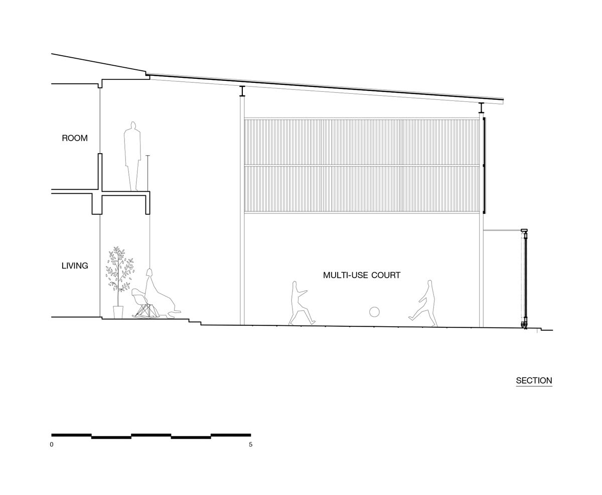 “เราแทบไม่ได้แตะบ้านเดิมของคุณพ่อคุณแม่เลย เพียงแค่จัดการส่วนฟาซาดให้เข้ากับพื้นที่ที่สร้างขึ้นใหม่ แต่สิ่งที่เราทำคือการยกหลังคาโรงรถเดิมให้สูงพ้นขึ้นไปจากความรับรู้ เพื่อให้พื้นที่ทั้งหมดเป็นพื้นที่เดียวกัน คุณแม่มองลงมาจากระเบียงก็ยังสามารถเห็นหลาน ๆ วิ่งเล่นได้อยู่ จากนั้นจึงหุ้มพื้นที่ทั้งหมดนี้ด้วยแผ่นพอลิคาร์บอเนตที่โปร่งแสงแต่ไม่โปร่งใส ช่วยให้ไม่สามารถมองเห็นกิจกรรมภายในบ้านจากภายนอกได้เพื่อความเป็นส่วนตัว แต่ยังรู้สึกได้ถึงบริบทเเละความเป็นไปรอบ ๆ บ้านได้อยู่”