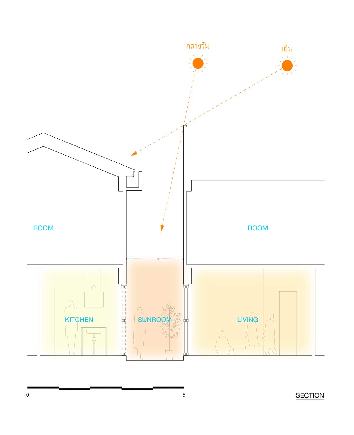 บ้านทั้งสองหลังนั้น มีพื้นที่ซึ่งคุณเคเรียกว่า Sun Room เป็นส่วนเชื่อมโยงพื้นที่ทั้งหมดไว้ด้วยกัน พื้นที่นี้เดิมทีเป็นตรอกที่อยู่ระหว่างบ้านทั้งสองหลัง แต่ด้วยลักษณะของพื้นที่ที่ทั้งเล็กเเละแคบ คุณเคจึงปรับให้พื้นที่ส่วนนี้กลายเป็นเสมือนลานกลางบ้านที่เมื่อเปิดบานเลื่อนของห้องต่าง ๆ โดยรอบก็จะสามารถเชื่อมโยงถึงกันได้หมด ไม่ว่าจะเป็นพื้นที่รับแขก ห้องครัว และห้องรับประทานอาหาร กลายเป็นพื้นที่อเนกประสงค์ขนาดใหญ่ที่ทุกคนในครอบครัวมาพบปะกัน