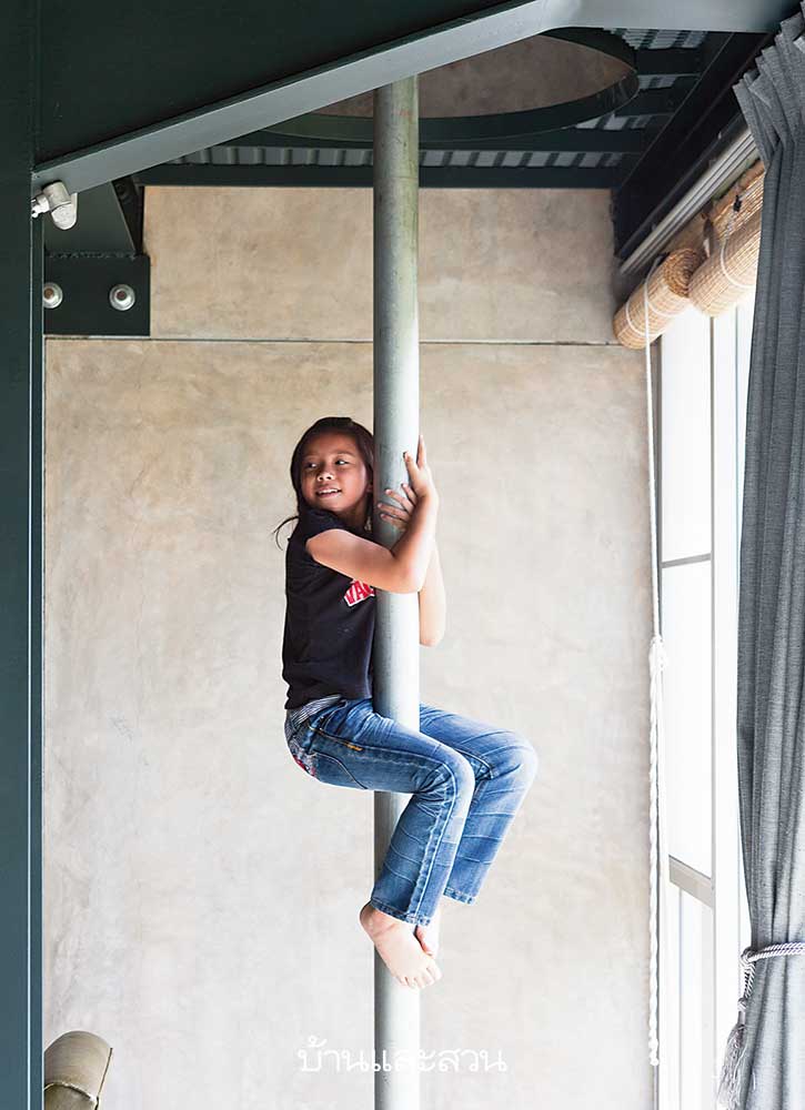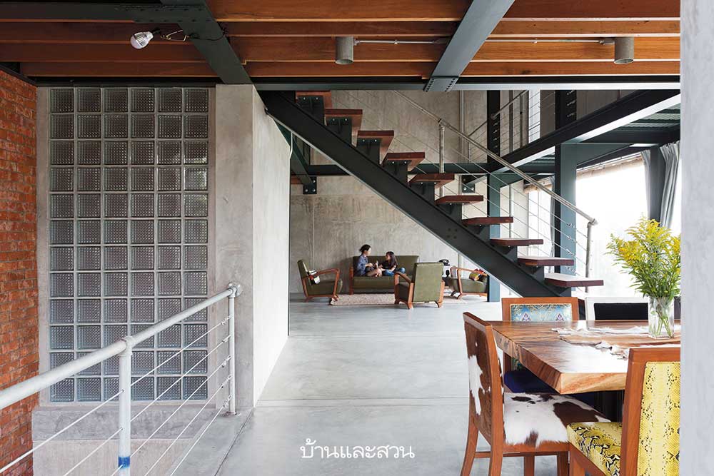 นอกจากจะมีห้องนอน 3 ห้องในชั้นล่าง รวมถึงส่วนนั่งเล่น ส่วนรับประทานอาหาร และส่วนครัวในชั้นสองแล้ว ยังมีชั้นลอยที่ออกแบบเป็นห้องทำงาน และห้องอเนกประสงค์ลอยอยู่เหนือพื้นที่นั่งเล่น โดยเปลี่ยนมาใช้โครงสร้างเหล็ก H-Beam และ I-Beam ทาสีเทาเข้ม ร่วมด้วยการปูพื้นไม้จริงสีน้ำตาลแดงช่วยให้บ้านดูอบอุ่นขึ้น นับว่าบ้านนี้มีรายละเอียดของงานปูน งานเหล็ก และงานไม้ครบถ้วน หลากหลาย ดูไม่น่าเบื่อ