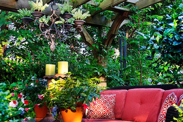 10. นำโคมไฟติดเพดานที่ไม่ใช้แล้วมาเป็นพร้อบตกแต่งสวน และนำโซฟานั่งเล่นสีแดงสดตัดกับสีเขียวของพรรณไม้ ก็ช่วยเพิ่มความสดใสให้กับสวนสวยได้ทันใด