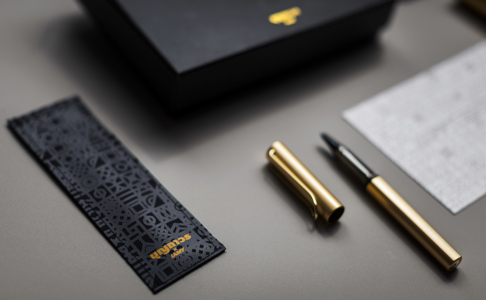 วนัส : “เนื่องจากสตูดิโอของเรามีโรงงานปักผ้าของตัวเอง งานปักจึงเป็นอีกเทคนิคหนึ่งที่ถนัดและเป็นเอกลักษณ์ของเรา จึงออกแบบให้ซองปากกามีลวดลายที่เชื่อมโยงกับตัวกล่อง แต่เพิ่มผิวสัมผัสพิเศษด้วยงานปัก โดยยังคุมโทนให้อยู่ในเฉดสีดำ เทา และทอง เหมือนเป็นการนำกระบวนการปักแบบเดิมมาผสมผสานลงไปในของใช้ยุคปัจจุบันให้ทันสมัยมากขึ้น”