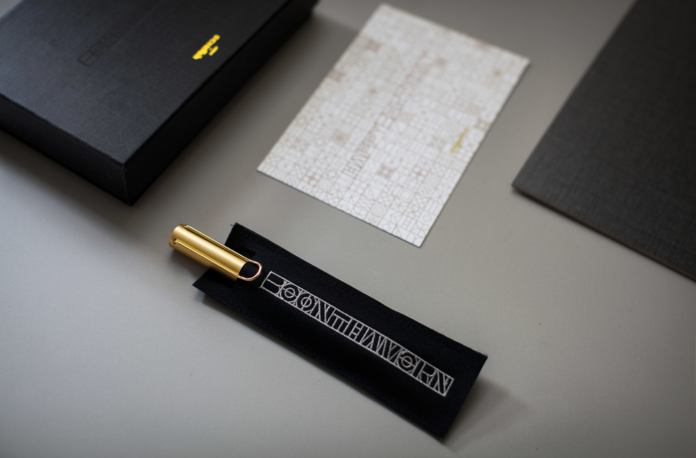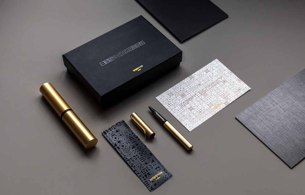 ณิชภัค : “ปกติคนรับของขวัญมักจะโฟกัสไปที่ของข้างในมากกว่า แต่เรากลับรู้สึกอยากให้คนรับได้ใช้เวลาชื่นชมกับตัวกล่องด้วย เพราะกล่องคือสิ่งที่ทำให้ของขวัญดูพิเศษขึ้น เรารู้สึกว่าของขวัญควรเป็นสิ่งที่ชวนให้รู้สึกถึงความเซอร์ไพรส์ ซึ่งไม่รู้ว่าข้างในคืออะไร ในขณะเดียวกันเราก็อยากให้กล่องดูเรียบและไม่อยากดูเป็นการเฉลิมฉลองเฉพาะโอกาสมากเกินไป เพราะนั่นจะทำให้กล่องถูกทิ้งหลังจากเปิดแล้ว เราจึงตั้งใจให้บรรจุภัณฑ์นี้กลายเป็นกล่องที่ใช้งานต่อได้หรือกลายเป็นของตกแต่งบ้านได้ด้วย ดังนั้นลวดลายที่ออกแบบจึงใช้เทคนิค Tone-on-Tone เป็นลายสีเทาเข้มบนกล่องสีดำสนิทเพื่อให้ดูเรียบนิ่งที่สุด ผสานกับสีทองให้เข้ากับตัวปากกาที่เป็นพระเอกหลัก