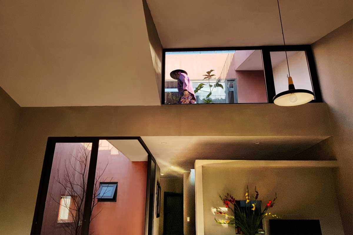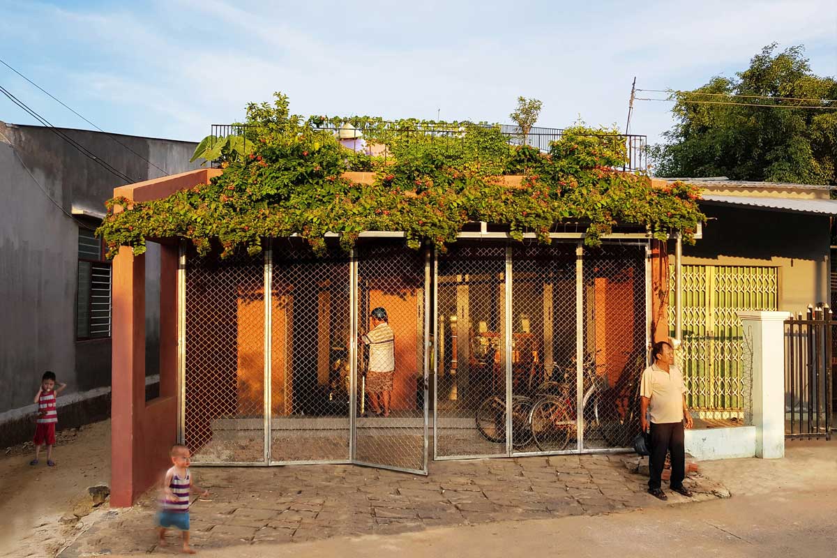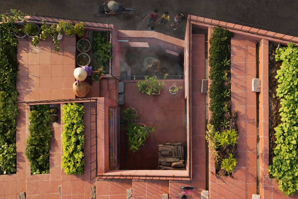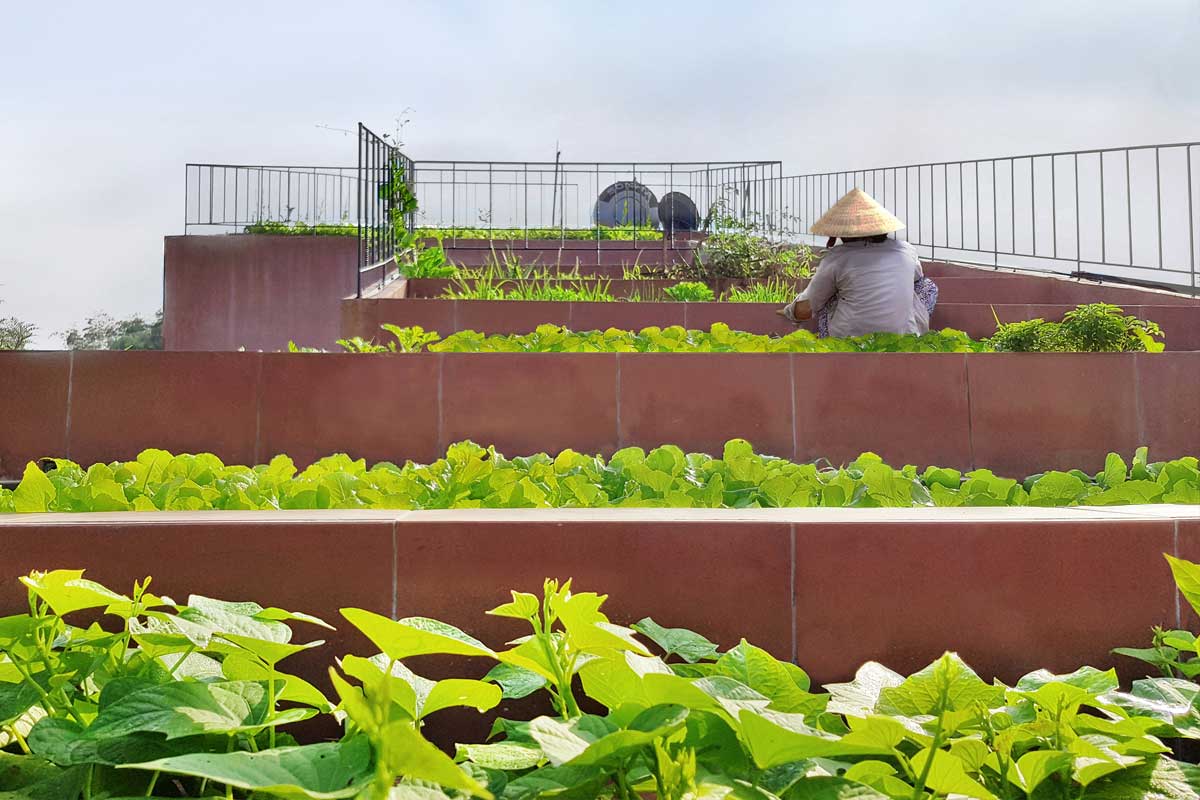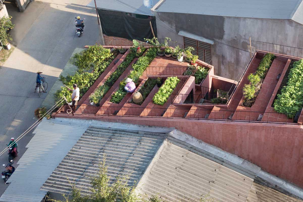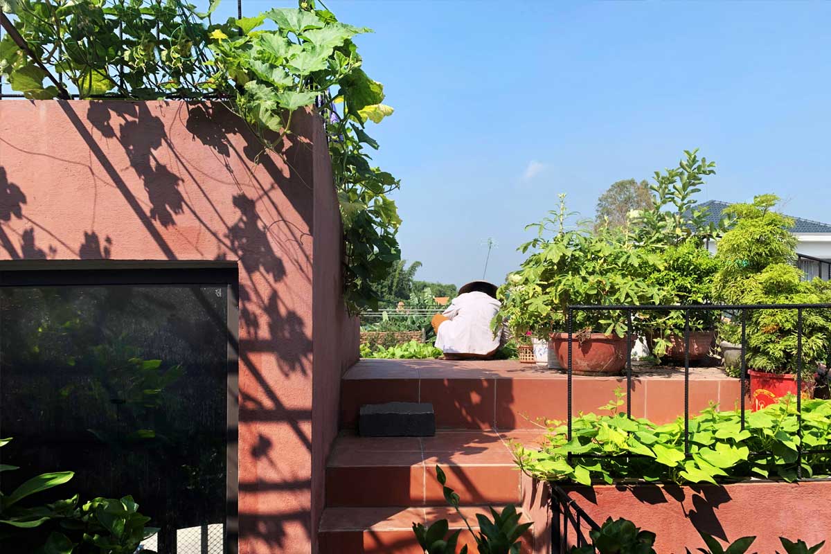 ส่วนด้านบนของหลังคาปูด้วยกระเบื้องดินเผา เข้ากับตัวบ้านที่ทาสีแดงอิฐ เพื่อเชื่อมโยงกับวัสดุพื้นถิ่นดั้งเดิมของเวียดนามที่ขึ้นชื่อเรื่องการใช้วัสดุธรรมชาติอย่างอิฐดินเผา นอกจากเจ้าของบ้านจะมีผักไว้รับประทานตลอดทั้งปีแล้ว ยังมีเหลือพอที่จะแบ่งให้กับเพื่อนบ้านอีกด้วย กลายเป็นการสร้างสัมพันธภาพที่ดี และก่อเกิดเป็นคอมมูนิตี้ใหม่ในหมู่บ้านแบบแยบยล