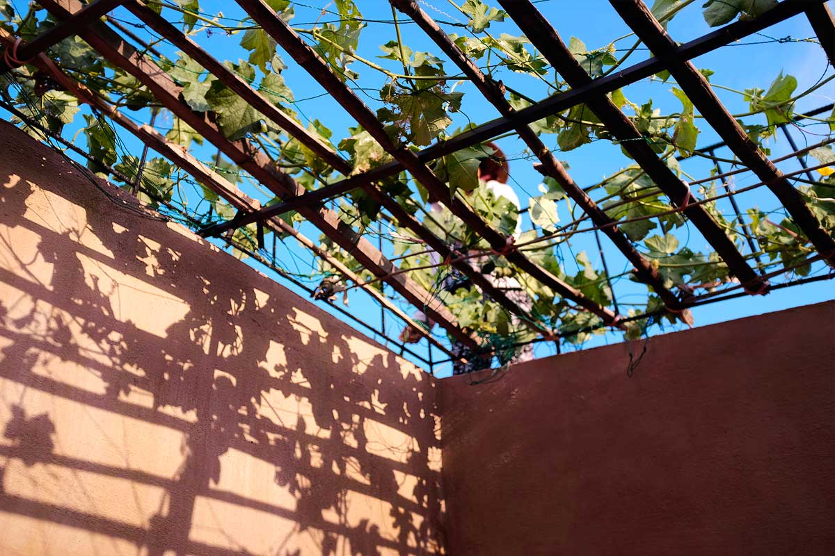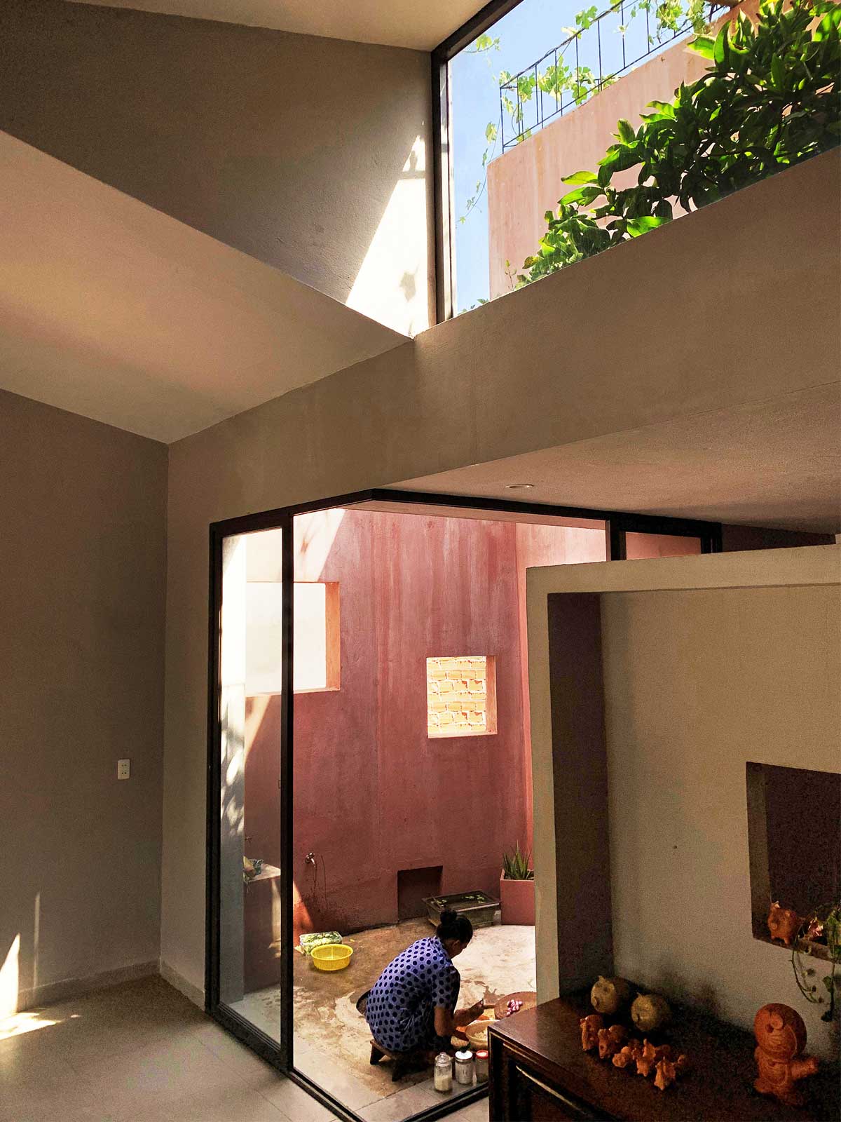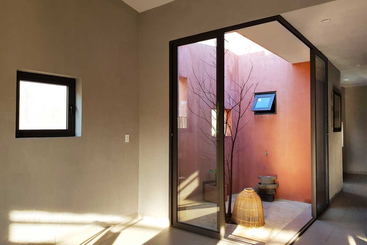 พร้อมกันนั้นยังได้ออกแบบคอร์ตยาร์ดไว้หลาย ๆ จุดในระดับความสูงที่ต่างกัน ซึ่งสัมพันธ์ไปกับโครงสร้างของบ้าน แปลงผักนี้จึงทำหน้าที่เป็นฉนวนกันความร้อนไม่ให้เเสงเเดดส่องกระทบเข้ามาในบ้านได้โดยตรง อีกทั้งยังช่วยให้แสงธรรมชาติและลมเข้าสู่ตัวบ้านผ่านช่องว่างระหว่างหลังคาแปลงผัก ภายในบ้านจึงรู้สึกปลอดโปร่งตลอดทั้งวัน