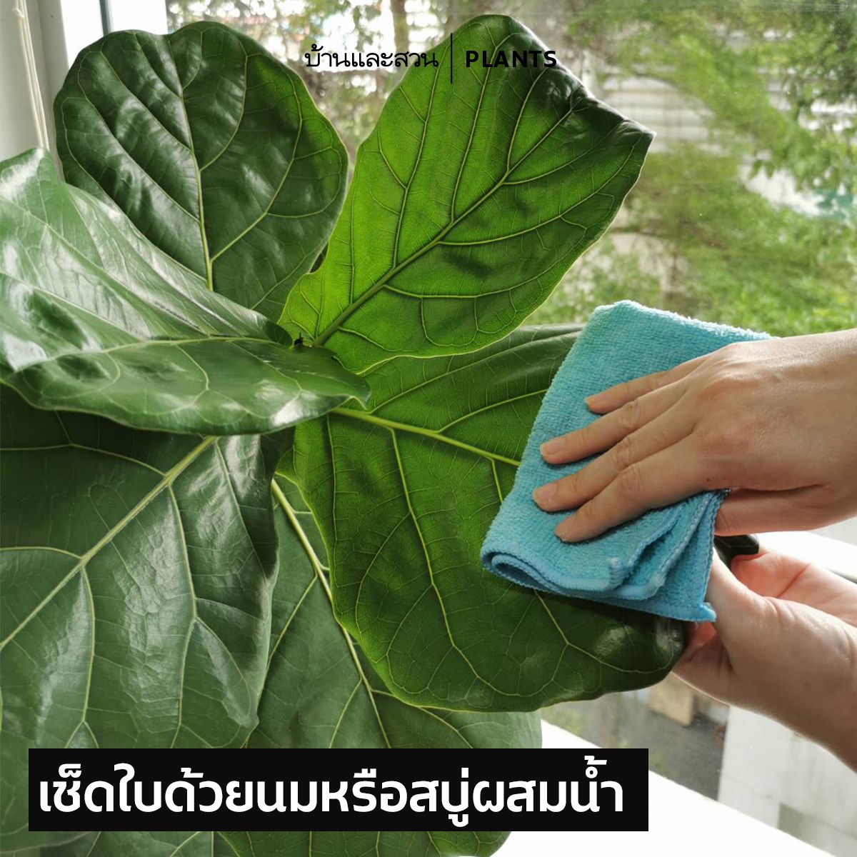 การเช็ดใบ มีหลายคนคาดหวังให้ใบมีความเงางามวิบวับ เลยใช้สารเคลือบใบเป็นตัวช่วย ซึ่งนั้นเป็นวิธีที่ผิด ควรหลีกเลี่ยงการใช้สารเคมีต่างๆ แม้แต่น้ำมันมะกอก หรือน้ำมันมะพร้าว ให้ใช้เพียงผ้าชุบน้ำสบู่อ่อนๆ หรือนม เช็ดใบๆ ที่ใบ ทุกสัปดาห์ ก็เพียงพอแล้ว หรือจะใช้น้ำเปล่า ก็ไม่ผิดนัก