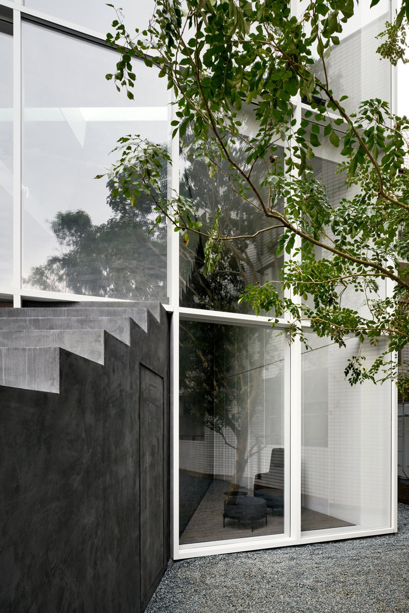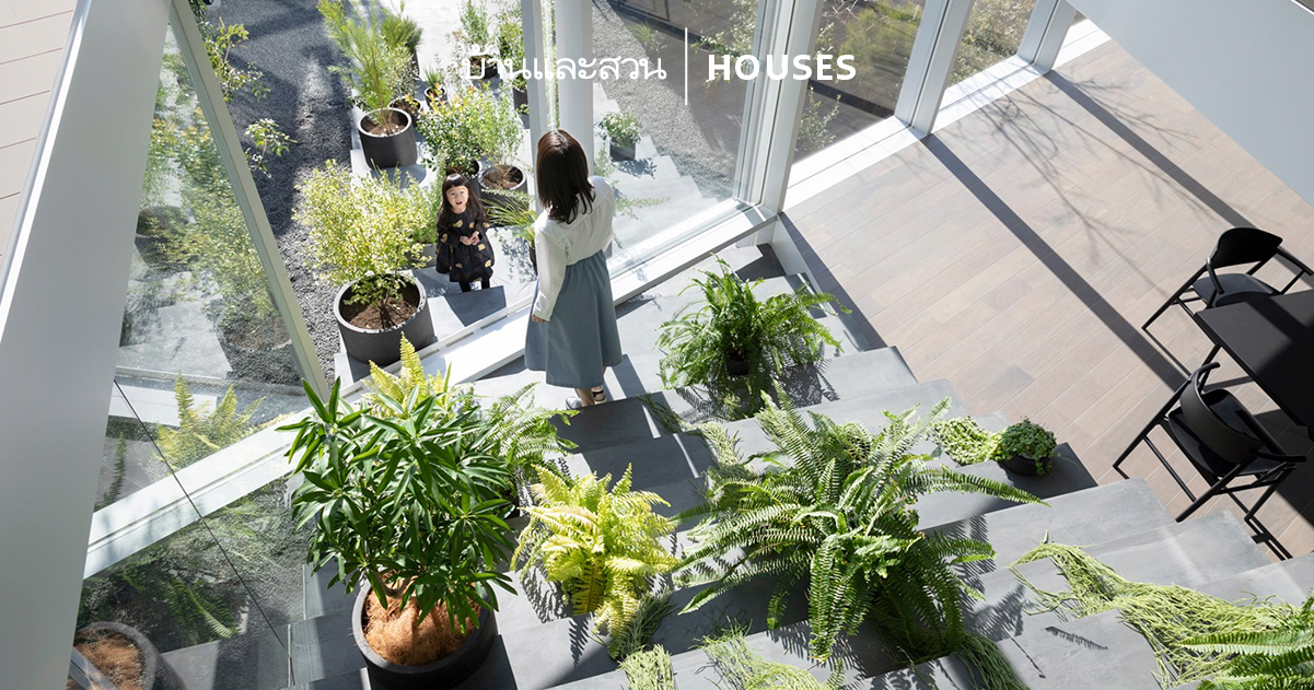 บ้านขั้นบันไดทะลุกระจกหลังนี้ อาจดูแปลกตาจากบ้านใกล้เรือนเคียงไปสักเล็กน้อย แต่นั่นได้สะท้อนถึงความชาญฉลาดในการแบ่งตำแหน่งชั้นที่พักออกจากกันชัดเจน เพื่อความเป็นส่วนตัวของสมาชิกในบ้าน แต่ก็ยังประนีประนอมให้สามารถมองเห็นความเคลื่อนไหวระหว่างกันและกันของสองครอบครัวได้ โดยมีกิมมิกของบ้านอย่างโครงสร้างบันได เป็นจุดเชื่อมโยงการตกแต่งภายในเข้ากับลานด้านนอกเข้าด้วยกันอย่างกลมกลืน รวมถึงพื้นที่ต่างระดับที่เชื่อมจากถนนสู่ท้องฟ้าก็เป็นอีกมุมมองที่ดูเท่ไม่เหมือนใครจริง ๆ