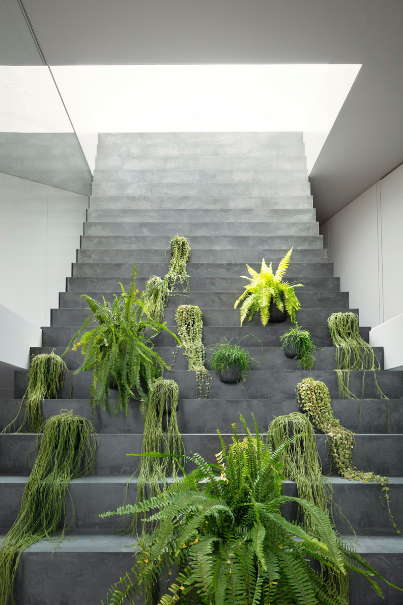 บันไดมีจุดเริ่มตั้งแต่ลานนอกบ้านด้านทิศใต้ ไต่ระดับทะลุฟาซาดกระจกผ่านชั้น 1 ขึ้นสู่ชั้น 2 ไปจนจรดพื้นที่ใต้ช่องหลังคาสกายไลท์ชั้น 3 (แต่ภายใต้บันไดที่เป็นกิมมิกของบ้านนี้ยังมีบันไดสำหรับการใช้งานจริงรวมถึงห้องน้ำซ่อนอยู่ข้างใต้) โครงสร้างบันไดภายนอกจึงมีหน้าที่เป็นส่วนเสริมในการวางกระถางต้นไม้ เพื่อสร้างความสดชื่นเวลามองผ่านผนังกระจกจากส่วนใช้สอยหลัก และบันไดนี้ยังกลายเป็นที่อาบแดดและปีนป่ายของแมวไปโดยปริยาย
