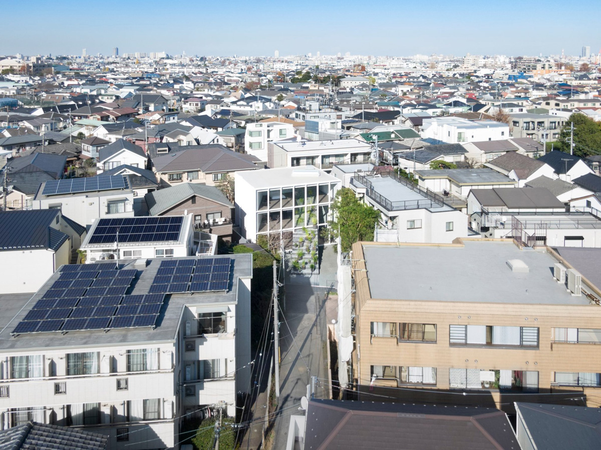 ทำเลที่ตั้งของบ้านอยู่ในย่านพักอาศัยอันเงียบสงบกลางกรุงโตเกียว บนที่ดินซึ่งรายล้อมด้วยบ้านเรือนและอพาร์ตเมนต์หลากหลายขนาด และเพื่อเป็นการเก็บรักษาต้นพลับ ต้นไม้ใหญ่ที่เจ้าของผูกพันไว้ Oki Sato จึงตั้งใจวางตำแหน่งอาคารและพื้นที่ใช้สอยของบ้านให้ค่อนไปทางทิศเหนือของที่ดินเป็นหลัก เพื่อเปิดรับแสงสว่าง สามารถมองเห็นเรือนพุ่มเขียวขจีของเหล่าต้นไม้ในสวน และต้นพลับที่จะออกลูกผลัดใบไปตามฤดูกาล ผ่านฟาซาดกระจกขนาดใหญ่ทางทิศใต้