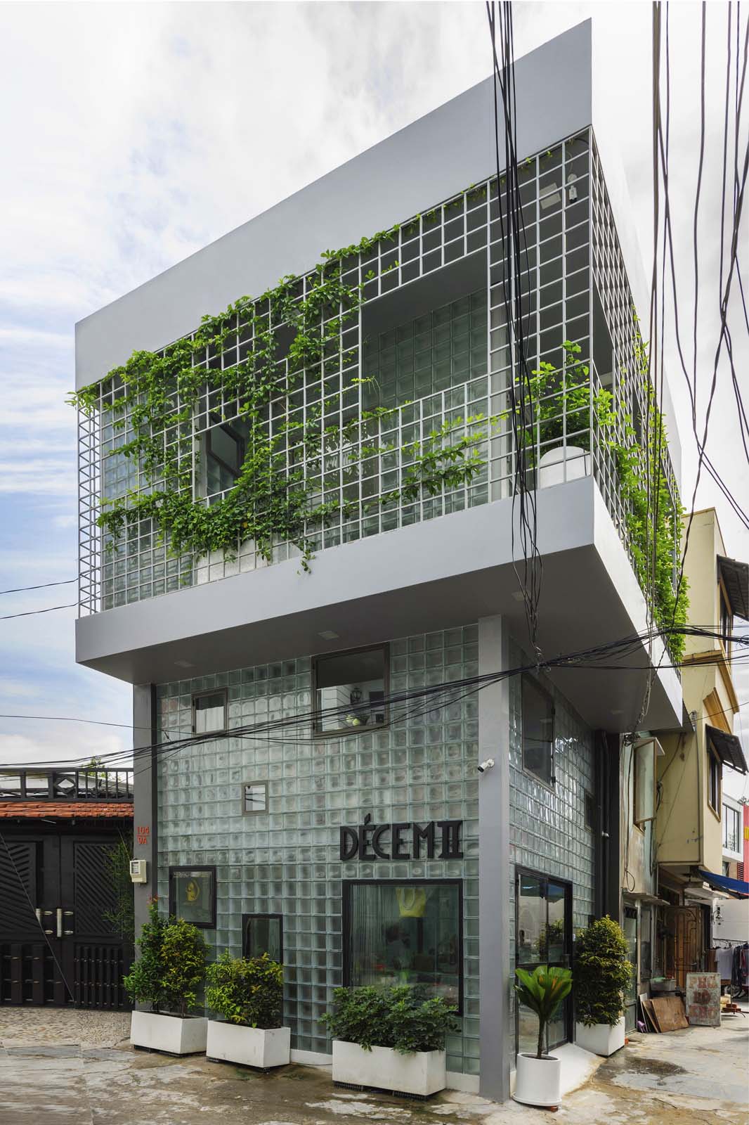 ตัวอาคารปิดทับด้วยฟาซาดที่ออกแบบเป็นแผงสำหรับให้ไม้เลื้อยเกาะเกี่ยวไปตามช่องสี่เหลี่ยมที่มีขนาดช่องละ 19×19 เซนติเมตร ล้อไปกับรูปทรงและขนาดของบล็อกแก้ว นอกจากเป็นการเพิ่มพื้นที่สีเขียวแล้ว ยังช่วยกรองความร้อนที่จะเข้าสู่ตัวบ้านโดยตรง แถมสร้างความเป็นส่วนตัวให้อีกชั้น