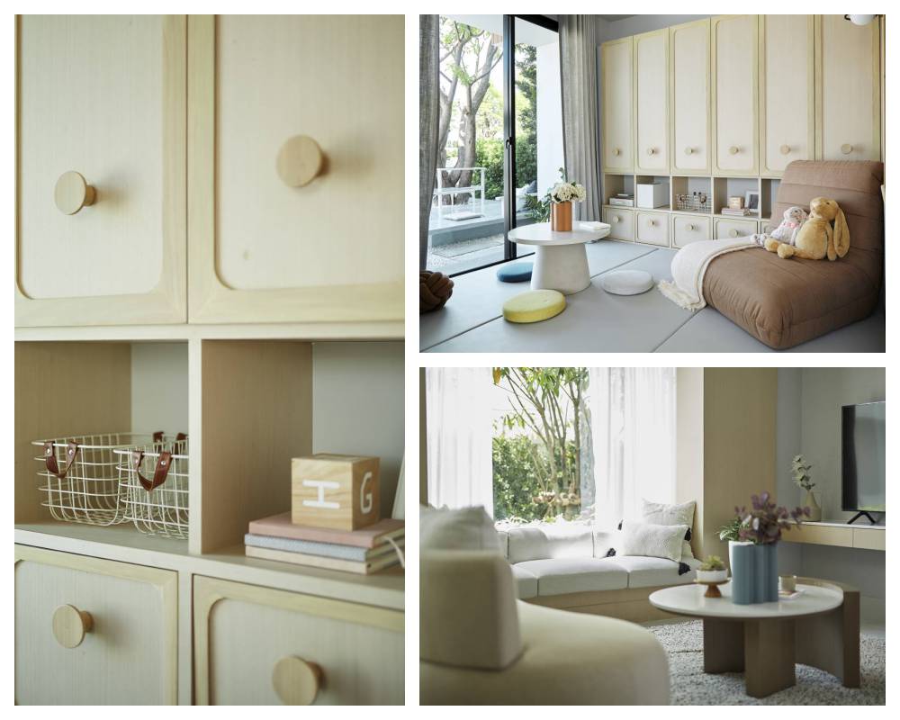 พื้นที่ใช้สอยภายในบ้านเด่นด้วยการออกแบบสเปซเเบบโอเพ่นเเปลน โปร่งสบายด้วยเพดานสูงถึง 2.7 เมตร พร้อมมีฟังก์ชันห้องเเบบ Muti Purpose ส่วนนี้เจ้าของสามารถปรับเเต่งได้ตามความต้องการ ไม่ว่าจะใช้เป็นพื้นที่นั่งเล่นพักผ่อน Kid’s Area หรือโฮมเธียเตอร์ ใกล้กันมีหน้าต่างเบย์วินโดว์ที่สร้างติดกับเฉลียงขนาดใหญ่ ช่วยให้ผู้อยู่อาศัยสามารถดื่มด่ำกับวิวธรรมชาติรอบ ๆ ได้เต็มที่ ทั้งยังเปิดรับเเสงให้ส่องสว่างได้อย่างทั่วถึง ในส่วนของ Living Area ออกแบบให้มีขนาดพื้นที่โล่งกว้างจัดวางโซฟาตัวใหญ่ได้อย่างสบาย ภายใต้พื้นที่ใช้สอยรวม162 ตารางเมตร บนพื้นที่ 37.5 – 64.7 ตารางวา