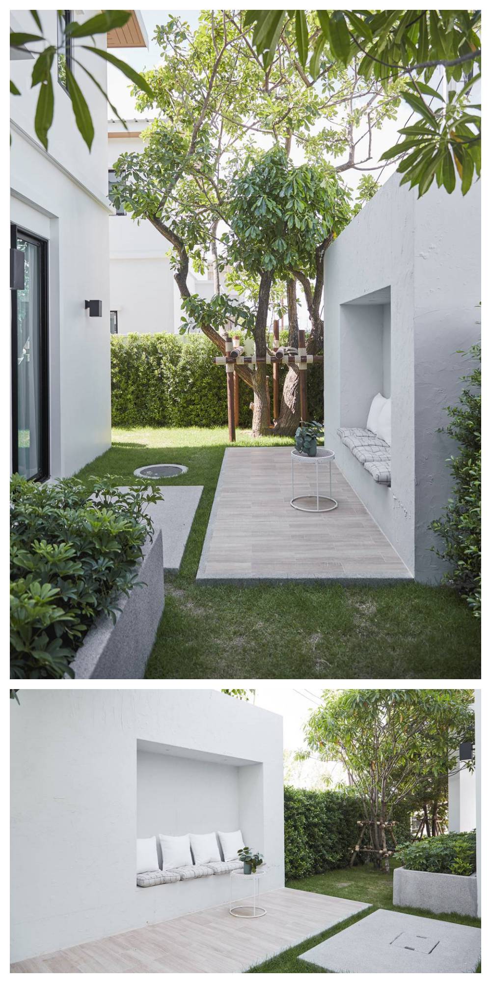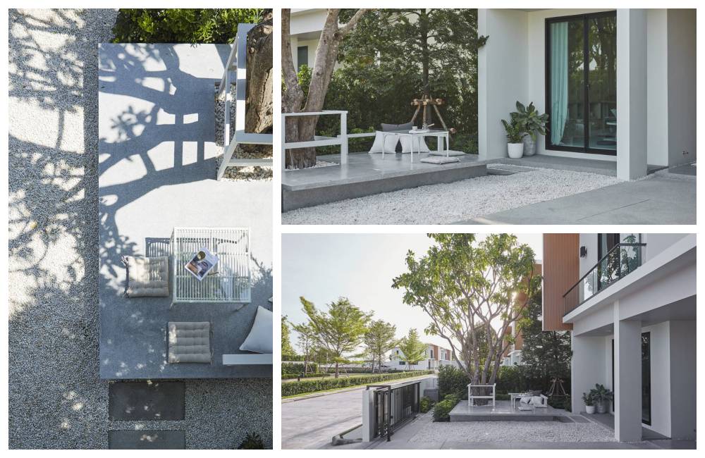 ในส่วนของพื้นที่สวนได้ออกแบบให้มีซุ้มนั่งเล่นนอกบ้าน และเเลนด์สเคปแบบ Semi-Outdoor เล็ก ๆ นอกจะดูแลรักษาง่ายแล้ว ยังทำให้สเปซภายในกับภายนอกถูกเชื่อมต่อกันอย่างลงตัว