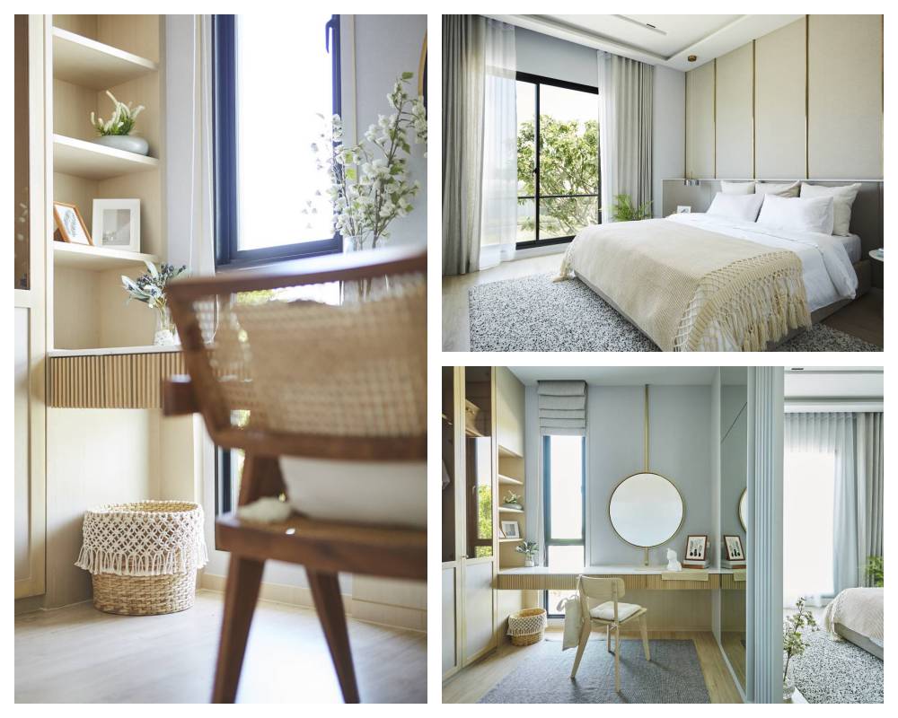 พื้นที่พักผ่อนชั้นสองจะสังเกตได้ถึงความโล่งกว้างของโถงบันไดจากแสงธรรมชาติที่เข้ามาจากสกายไลท์ ในส่วนของห้องนอนใหญ่ หรือ Master Bedroom ได้รับการออกแบบให้มีขนาดฝ้าเพดานสูงถึง 3 เมตร ล้อมรอบด้วยผนังกระจกบานใหญ่เพื่อเปิดรับแสงธรรมชาติช่วยให้ห้องดูกว้างและโปร่งสบาย สามารถวางเตียงได้ถึงขนาด 6 ฟุต และยังสามารถวางโต๊ะดูทีวีเพิ่มเติมตรงปลายเตียง นอกจากนี้สเปซของห้องยังออกแบบไว้รองรับการต่อเติมเพิ่มในส่วนของห้องเเต่งตัว หรือ Walk-in Closet พื้นที่ในฝันสำหรับสาว ๆ ที่มาพร้อมห้องน้ำในตัว การตกแต่งภายใน ถ่ายทอดแนวคิด Minimal Eco Living ผ่านวัสดุธรรมชาติ และการใช้สีโทน Neutral Pastel ที่ดูอบอุ่นและสบายตา