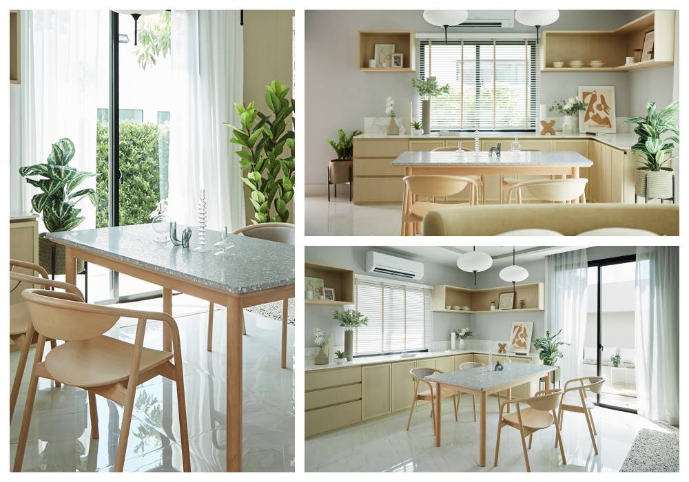 พอเดินเข้ามาโซนด้านหลังบ้านจะพบกับส่วนรับประทานอาหารขนาดใหญ่ ที่สามารถบิลท์อินเคาน์เตอร์บาร์ หรือพื้นที่เก็บของเพื่อเพิ่มประโยชน์ใช้สอย โต๊ะรับประทานอาหารรองรับสมาชิกครอบครัวได้ถึง 6-8 ที่นั่ง อีกทั้งยังมีประตูบานเลื่อนกระจกขนาดใหญ่ที่สามารถมองออกไปรับวิวสวนได้ชัดเจน ไม่ว่าจะอยู่มุมไหนก็สามารถเป็นมุมพักผ่อนที่ให้ความรู้สึกสบายเเละผ่อนคลายไปกับธรรมชาติได้อย่างใกล้ชิด