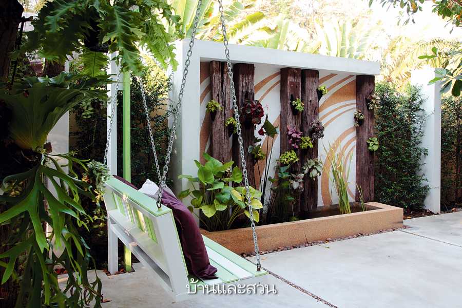 “สำหรับส่วนสุดท้ายคือสวนหลังบ้าน เดิมปลูกจิกน้ำต้นใหญ่แผ่กิ่งใบจนทึบผมตัดแต่งกิ่งให้โปร่ง เพราะตั้งใจออกแบบเป็นสวนแนวตั้งพร้อมบ่อน้ำเล็กๆหากร่มเกินไปก็ไม่สามารถปลูกต้นไม้อื่น ๆ ได้ และใช้เป็นจุดนำสายตาเพื่อเพิ่มลูกเล่นให้กำแพงเรียบ ๆ ผมยังทำชิงช้าไว้นั่งเล่นในมุมนี้ เมื่อเจ้าของบ้านมาใช้งานแล้วเห็นสีเขียวของต้นไม้ ใบไม้ จะได้รู้สึกสดชื่นขึ้น” ส่วนเรื่องการเลือกใช้พรรณไม้ รวมถึงการดูแลสวน คุณสันต์และคุณเอ๋เล่าเพิ่มเติมว่า