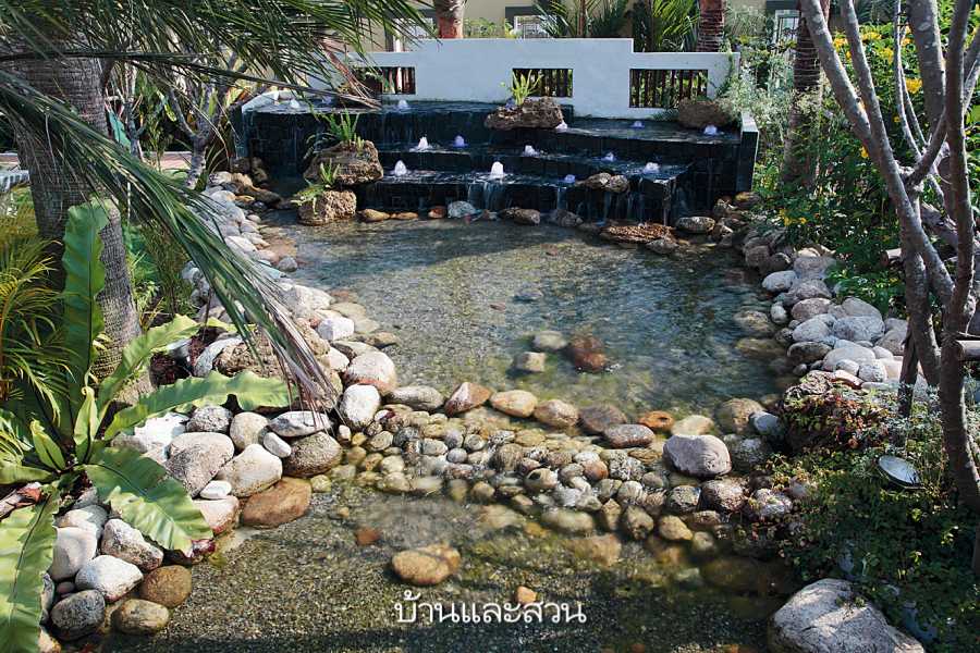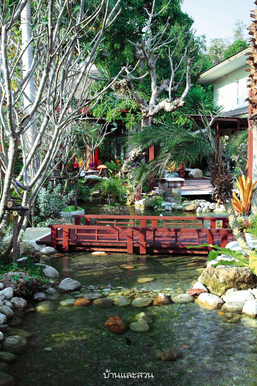 บนเนื้อที่กว่า 1 ไร่ คุณชาติได้หยิบยกธรรมชาติสวยๆ ตามริมลำธารมาจัดจำลองไว้ที่บ้านหลังนี้ให้กลายเป็นสวนน้ำแสนสดชื่นรื่นตา โดยผสมผสานสไตล์โมเดิร์น ไทย และทรอปิคัลเข้ากันอย่างลงตัว ซึ่งเป็นการออกแบบตามความชอบและเพื่อให้เหมาะสมกับการใช้งานของเจ้าของบ้าน คุณชาติเล่าถึงแนวคิดการจัดสวนว่า “การออกแบบสวนนี้ผมได้วางคอนเซ็ปต์ให้เกิดความต่อเนื่องเชื่อมโยงด้วยเส้นโค้งของรูปทรง รวมทั้งลวดลายบนพื้นและผนังให้กลมกลืน ดูลื่นไหลไปกับสายน้ำ เพราะสิ่งสำคัญของสวนนี้คือน้ำซึ่งอยู่ด้านหน้าฝั่งซ้ายของพื้นที่ ผมออกแบบเป็นชั้นน้ำตกรูปทรงโมเดิร์นเรียบ ๆ ผสานเข้ากับลำธารแบบธรรมชาติและบ่อเลี้ยงปลาคาร์ป ตกแต่งด้วยหินฟองน้ำ หินปูน หินภูเขาไฟ กรวดแม่น้ำพร้อมปลูกพรรณไม้โดยรอบ และมีสะพานไม้เล็ก ๆ ไว้เดินข้ามลำธารหรือยืนชมวิวสวย ๆ ของสวนนี้