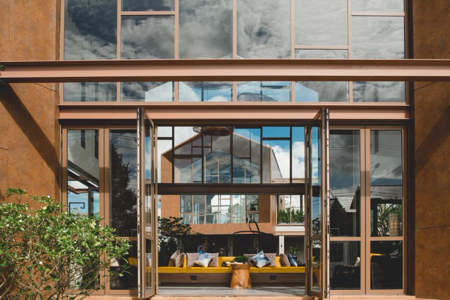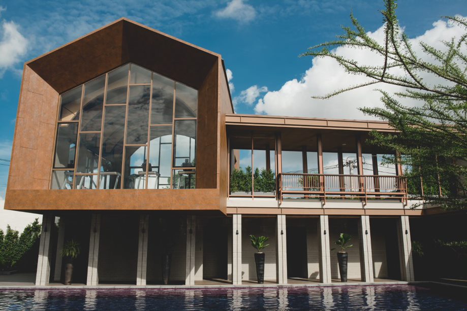 โดยผู้ออกแบบได้ทำการบิดตัวอาคารเล็กน้อยเพื่อให้เกิดมุมมองที่สามารถมองเห็นวิวโดยรอบได้แบบพานอรามา ในส่วนของฟาซาดอาคารดึงเทคนิคการซ้อนแผงฝาเรือนที่ซับซ้อนและมีเสน่ห์แบบไทย ๆ มาใช้ ไม่ว่าจะเป็นลวดลายของฝาปะกน ไม้ระแนง โดยปรับใช้วัสดุให้เข้ากับยุคสมัยมากขึ้นทำให้ได้อารมณ์ความโมเดิร์นที่ยังคงกลิ่นอายของวันวานไว้ โดยในส่วนของล็อบบี้ออกแบบเป็นพื้นที่เปิดโล่งแบบ open air เหมือนเรานั่งริมสระน้ำและรับลมธรรมชาติ