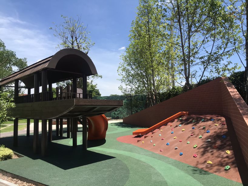 ในส่วนของชานกลางบ้านถูกแทนที่ด้วยสระว่ายน้ำ ที่สร้างความเซอร์ไพร้ส์ด้วยกระเบื้องสีม่วงเม็ดมะปราง ดูแปลกตาและหรูหราในตัว ให้ความรู้สึกเหมือนคุณนั่งชิลริมคลองบางกอกน้อย ต่อเนื่องไปยังพื้นที่สวนที่ยังคงคอนเซ็ปต์ความเป็นแม่น้ำกับบ้านเรือนและชานชาลาริมน้ำด้วยเส้นสายในสวนที่พริ้วไหว ที่มาพร้อมเครื่องเล่น educational playground รูปทรงของเรือที่แล่นอยู่ในคลองบางกอกน้อย เสริมให้เด็ก ๆ ได้เรียนรู้อดีตผ่านพื้นที่กิจกรรม