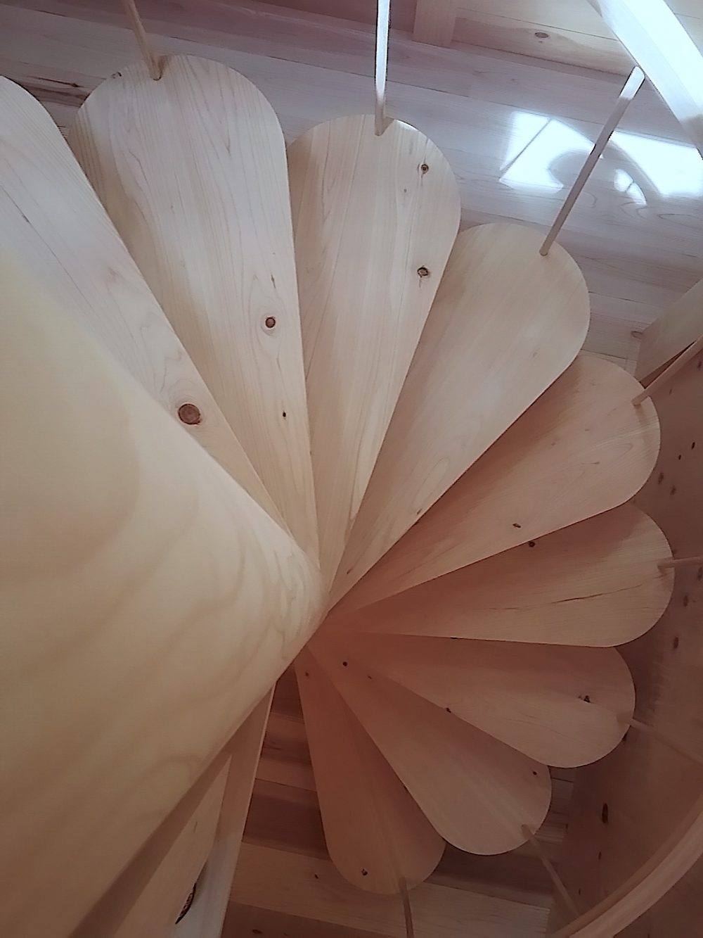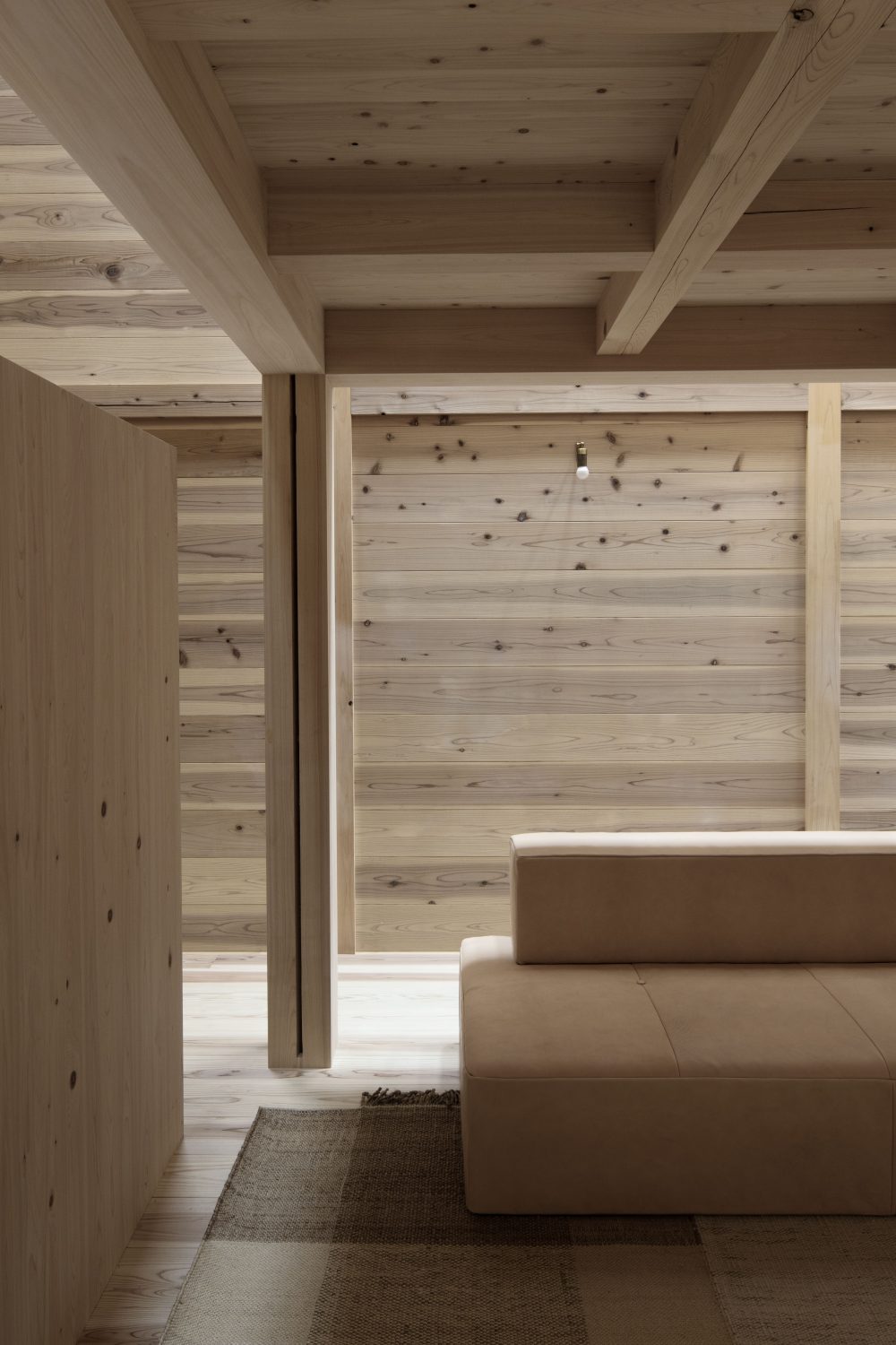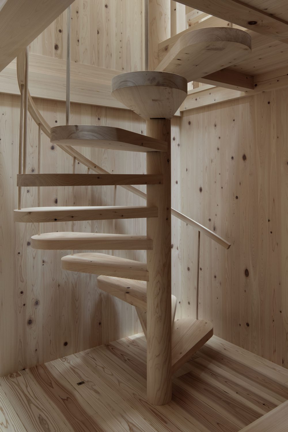 ขณะที่การออกแบบพื้นที่ใช้สอยภายในได้เเบ่งพื้นที่ออกเป็น 2 ชั้น ทันทีที่เปิดประตูหน้าบ้านซึ่งเนียนไปกับผนังด้านนอกเข้ามา จะพบกับพื้นที่เเบบเปิดโล่งมีทั้งมุมนั่งเล่น มุมรับประทานอาหาร ห้องน้ำ และห้องซักรีด ด้านข้างเว้นสเปซสำหรับเป็นทางเดินที่มีเพดานสูงโปร่งเเบบดับเบิ้ลสเปซ ช่วยให้เเสงจากสกายไลท์กระจายลงมายังพื้นที่ชั้นล่างอย่างทั่วถึง ไม่อุดอู้เเละทึบตันเเม้จะไม่มีหน้าต่างเลยสักบานก็ตาม ก่อนจะขยับขึ้นสู่ห้องนอนส่วนตัวบนชั้น 2 ด้วยบันไดวนที่ทำจากไม้สนเช่นกัน โดยเมื่อหากมองลงมาด้านล่างขั้นบันไดวนนี้จะดูสวยคล้ายพัด หรือกลีบดอกไม้ที่ค่อย ๆ คลี่บาน