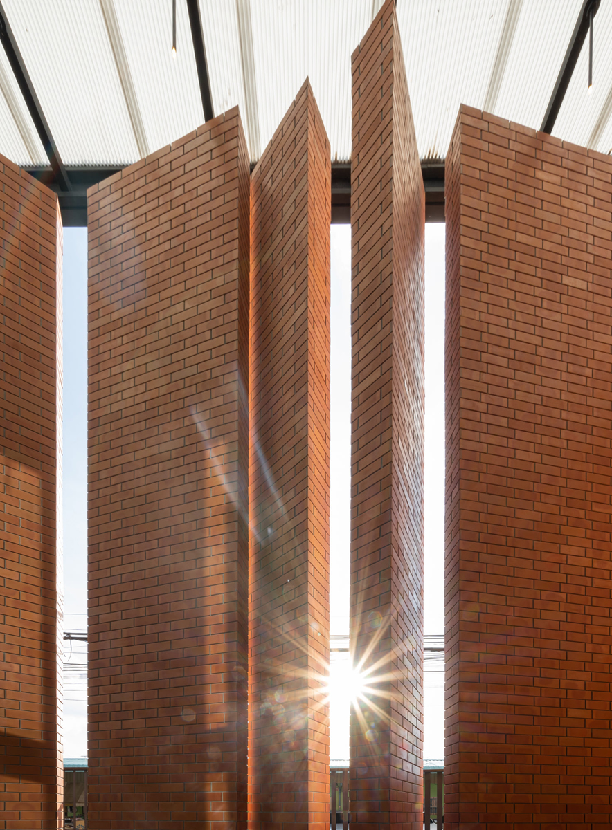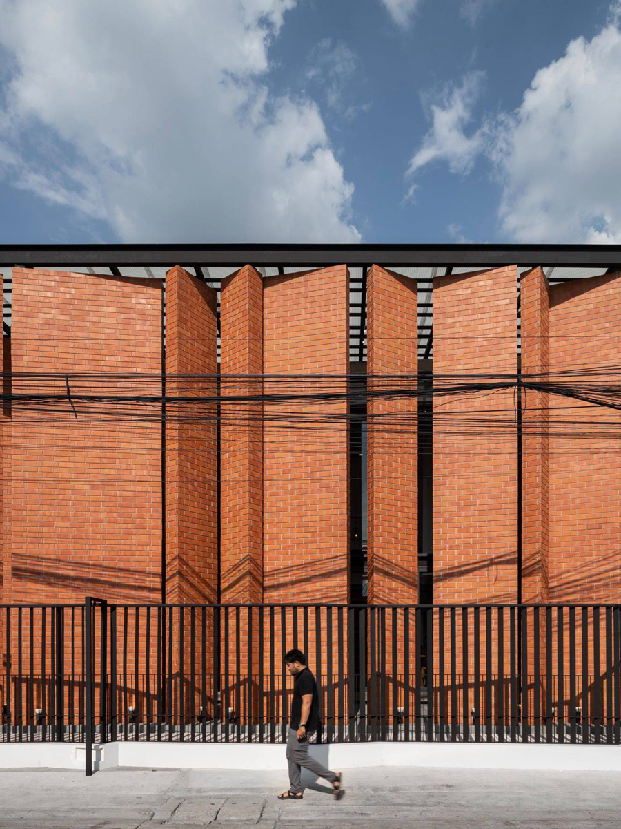 นี่คือ แบบบ้านอิฐ ที่กล้าหันหน้าประจันทิศตะวันตกอย่างสง่าผ่าเผย ที่เรากล่าวแบบนั้นก็เพราะว่ากำแพงขนาดมหึมาความสูง 7.5 เมตร ที่ตั้งตระหง่านอยู่ด้านหน้าบ้าน ‘Pakkret House’ หลังนี้ นอกจากจะมีฟังก์ชันไว้ “บังแดด” ยามบ่ายที่จัดว่าร้อนเอาเรื่อง มันยังถูกซอยเป็นริ้ว ๆ ให้ปริออกจากกันเพื่อเหตุและผลบางประการ ดังคำอธิบายของ เชิงชาย เรียวเรืองแสงกุล สถาปนิกจาก Archimontage Design Fields Sophisticated ผู้ออกแบบที่ว่า