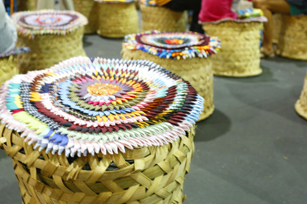 แม้แต่เก้าอี้ที่นั่งยังคงคอนเซ็ป “โลกหลอมรวม” ในการรวมวัสดุต่างๆเข้าด้วยกัน ไม่ว่าจะเป็นตะกร้าเก็บลำไย ฟางข้าว และพรมเช็ดเท้าที่ทำจากเศษผ้า ออกมาเท่ไม่ซ้ำใครเลยทีเดียว
