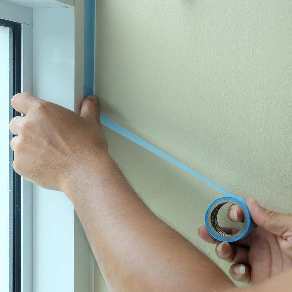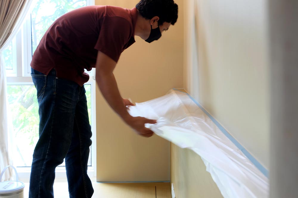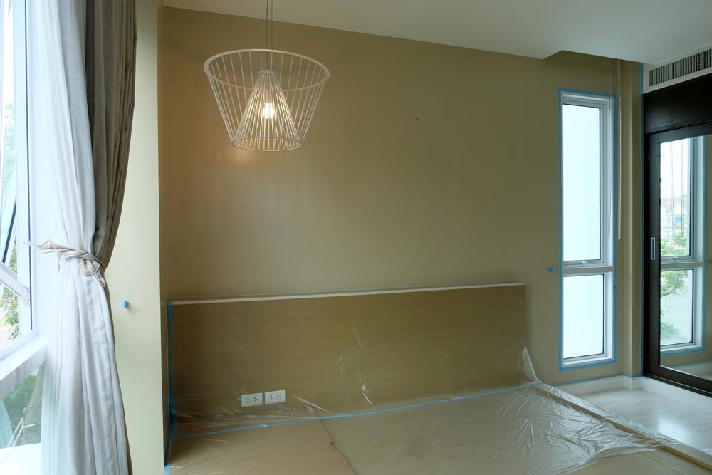 2. กั้นขอบเขตการทาสีด้วย Drop Sheet Tape ซึ่งเป็นพลาสติกชั้นดีสำหรับป้องกันสีกระเด็นไปโดนเฟอร์นิเจอร์อื่น ๆ ภายในห้อง