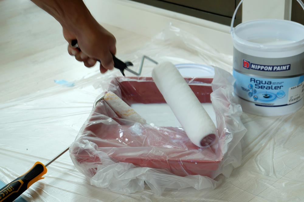 3. ทาสีรองพื้น ด้วยสี นิปปอนเพนต์ อะควา ซีลเลอร์ สูตรน้ำ สีรองพื้นสำหรับปูนเก่า กลิ่นไม่ฉุน ช่วยป้องการการเสื่อมสภาพของสีทับหน้า โดยทาสีรองพื้นจำนวน 2 เที่ยว