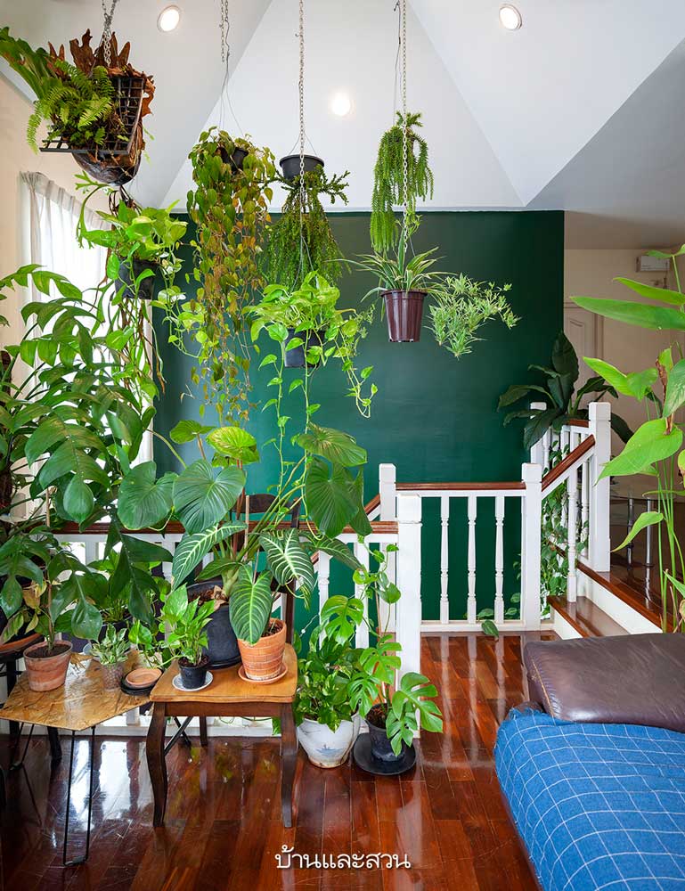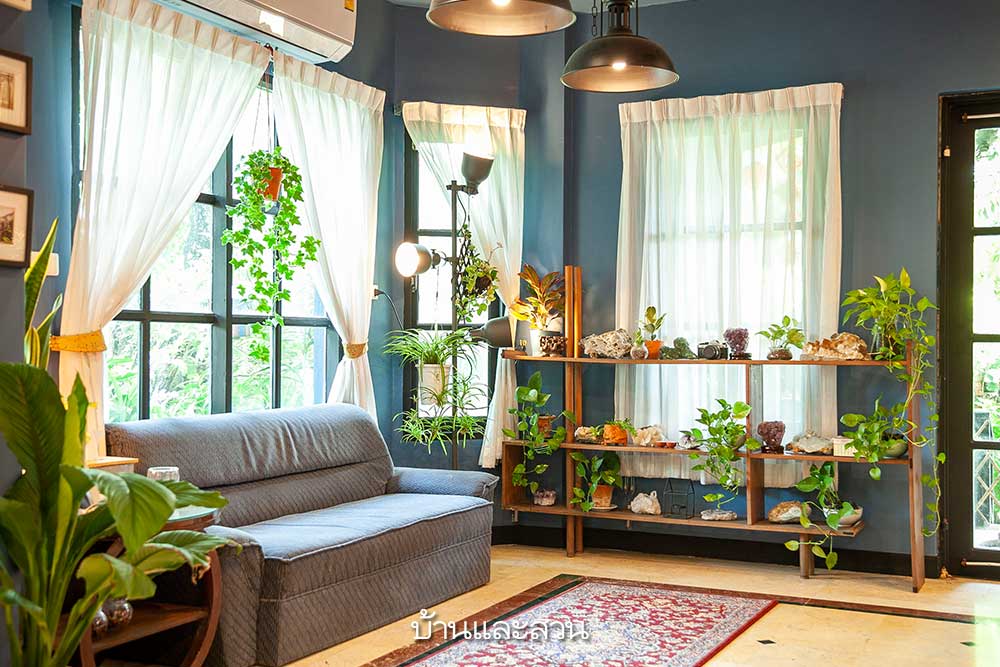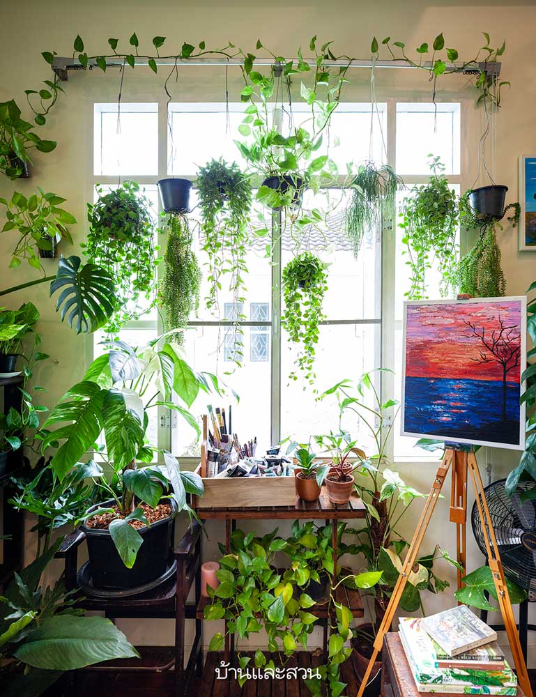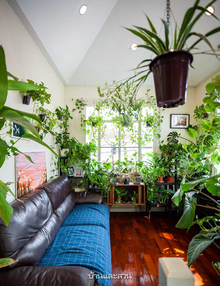 “เราจะไม่เลือกต้นไม้ที่ปลูกยาก คือเรารู้อยู่แล้วว่าต้นไหนจะปลูกยาก หรือเราแค่คิดเองว่ามันยากอย่าง ไทรใบสัก ยางอินเดีย ไหนจะราคาแพงอีก ซื้อมาแล้วถ้าตายใครจะรู้ เราก็ไม่เสี่ยงดีกว่า ก่อนซื้อก็ดูก่อนว่าต้องเลือกให้เข้ากับมุมบ้าน พอเราจัด ๆ ไปจะเห็นว่ามุมนี้ขาดต้นอะไร ก็จะมองหาต้นไม้ใหม่มาวางให้เหมาะกับมุมนั้น ๆ มากกว่า แหล่งซื้อก็จะมีทั้งซื้อที่ตลาดต้นไม้และซื้อออนไลน์ค่ะ ตอนที่ซื้อออนไลน์ก็จะลุ้นหน่อยว่า ต้นไม้จะถึงเมื่อไหร่ ต้นไม้จะช้ำไหม จนเราคิดว่าทำไมต้องมานั่งลุ้นแบบนี้ จึงหันไปซื้อเอง เลือกเองดีกว่า อย่างที่ไปบ่อยก็ตลาดต้นไม้สมบัติบุรี เพราะอยู่ใกล้บ้าน ราคาถูก แล้วต้นไม้ก็มีสภาพดีด้วย หากเรารู้แล้วว่าจะเลือกไม้สูง ๆ วางมุมนี้ หรือเลือกไม้เลื้อยให้แขวนตรงนี้ เราก็ซื้อต้นที่สูงและต้นที่เลื้อย ๆ ยาว ๆ เลยค่ะ เพราะบางทีเลี้ยงเองกว่าจะโตก็ต้องใช้เวลานาน สู้ได้เห็นว่ามันเลื้อยยาวสวย ๆ แบบที่ชอบไปเลยดีกว่า”