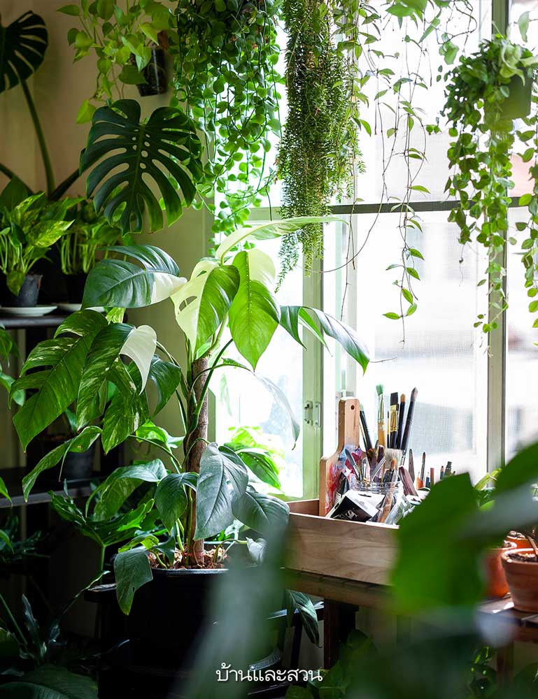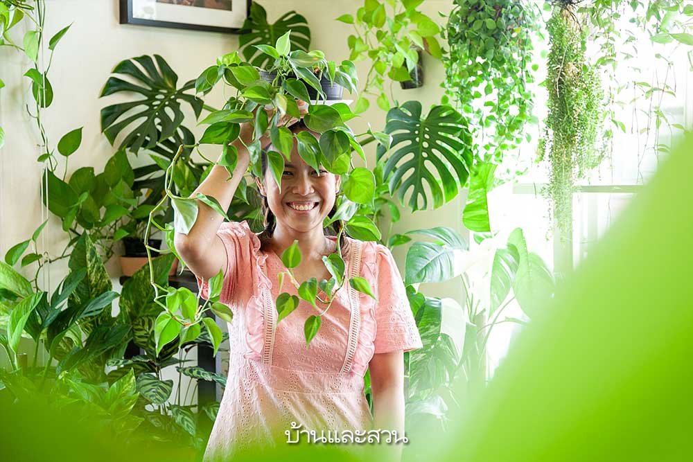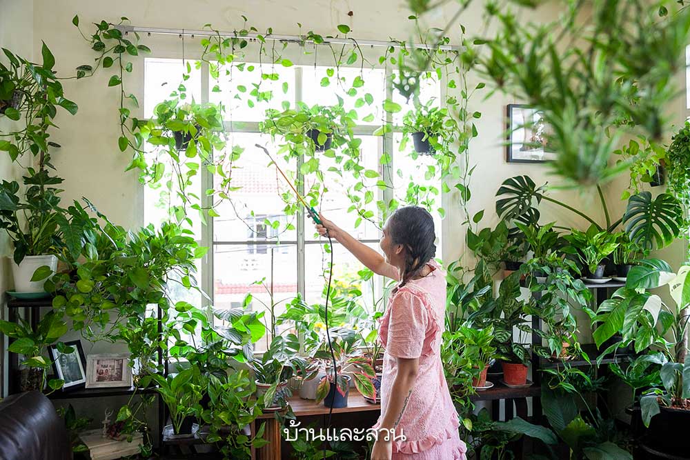 “ช่วงหน้าร้อน เคยเจอปัญหาใบฟุบ ก็ต้องคอยดูฉีดสเปรย์รดน้ำทั้งวัน เท่าที่ปลูกเลี้ยงมาก็น้อยมากที่จะตาย แต่ก็ไม่ซีเรียสว่าต้นไม้จะตาย ใบจะไหม้ หรือใบร่วง เพราะเข้าใจว่านี่คือธรรมชาติ ถ้าไม่ไหวก็จะนำไปอนุบาลนอกบ้านก่อน พอต้นไม้เริ่มฟื้นตัว อย่าง ฟิโลเดนดรอน พิ้งค์ ปริ้นเซส ที่ฟื้นตัวจนออกใบด่างสีชมพูมาให้ชื่นชม เราถึงจะนำเขาเข้ามาในบ้าน เราปลูกต้นไม้เพราะว่าความชอบ ปลูกแล้วสบายใจ หากปลูกแล้วเครียดทุกข์ใจ กลัวจะเกิดปัญหาใบไหม้ ใบร่วง ก็อย่าปลูกดีกว่า”